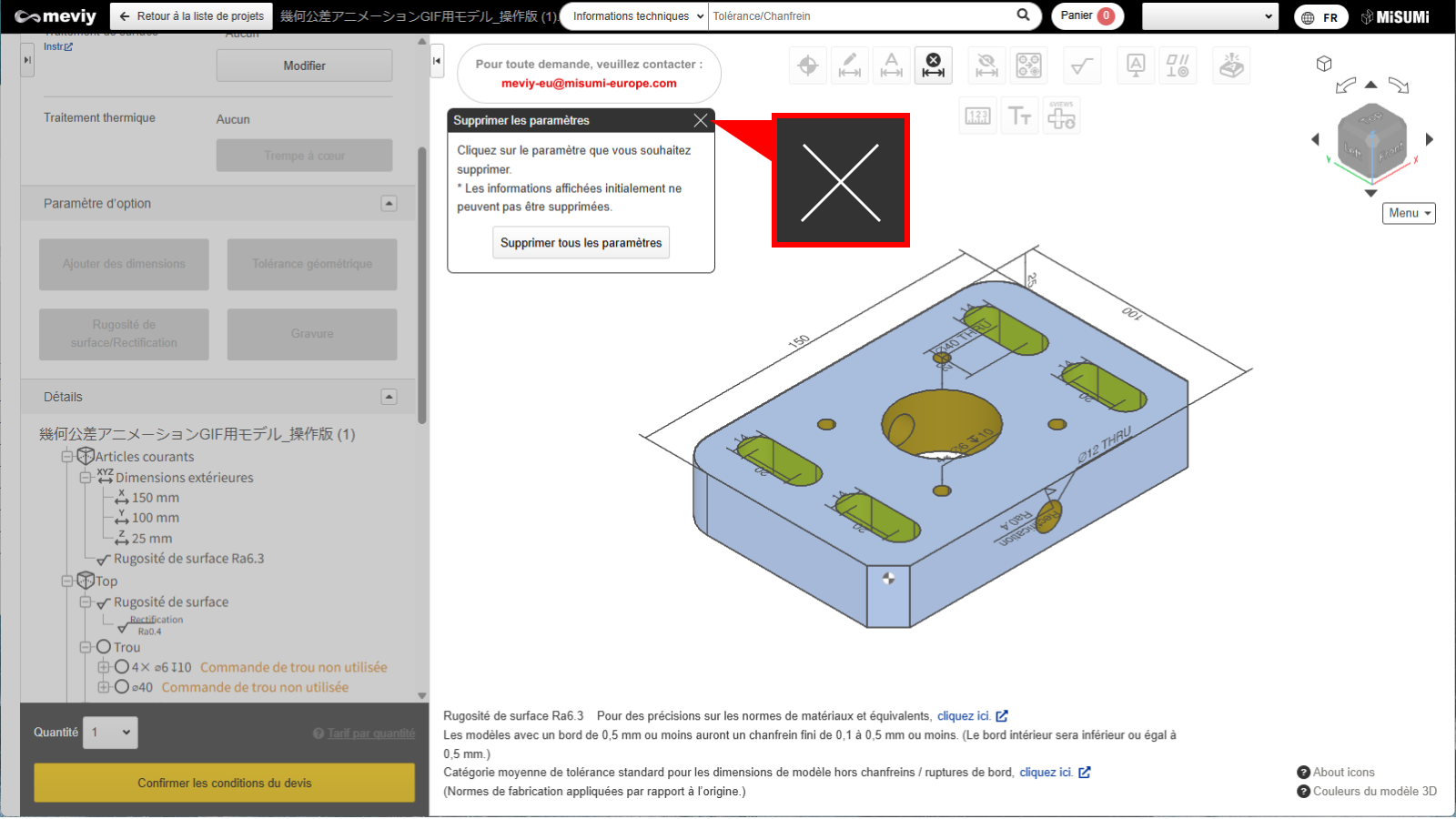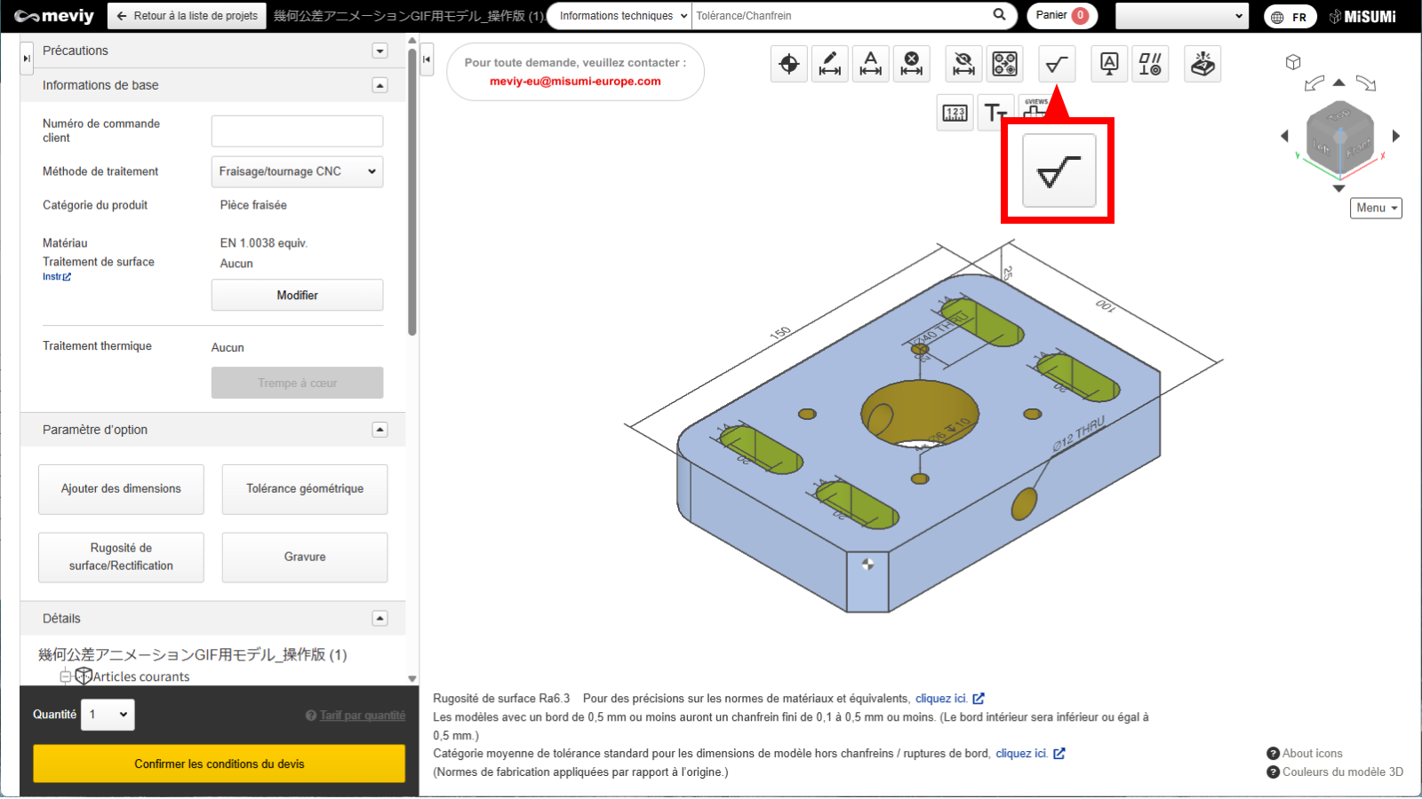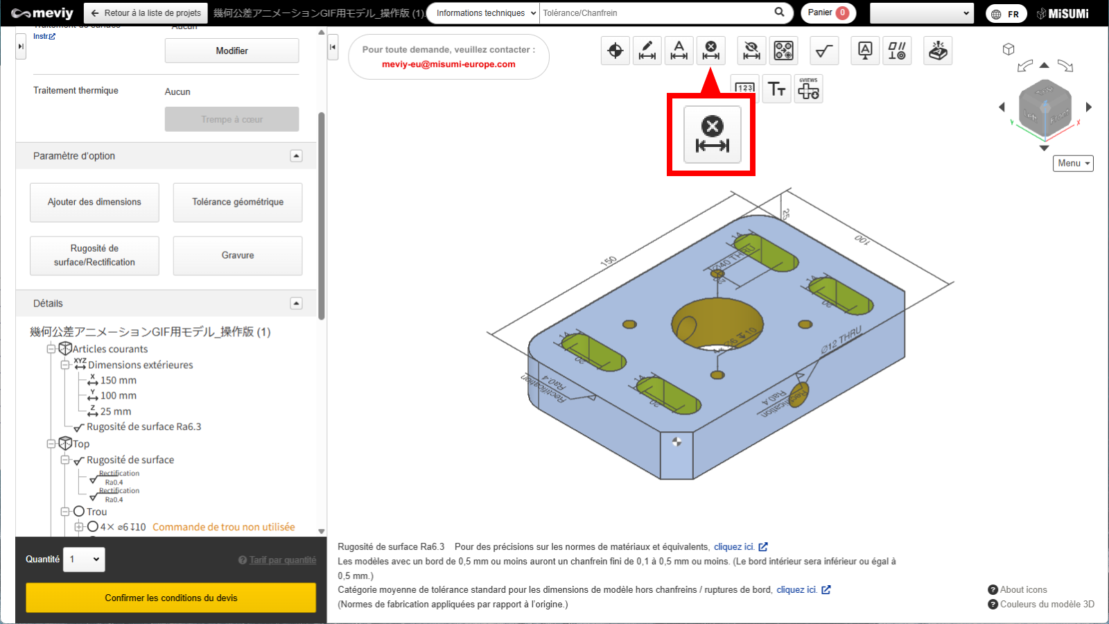 8.Pour modifier la rugosité de surface spécifiée, cliquez sur le symbole de rugosité de surface dans l’arbre sous Détails ou dans le visualiseur pour afficher la boîte de dialogue Rugosité de surface et mettre à jour les paramètres.