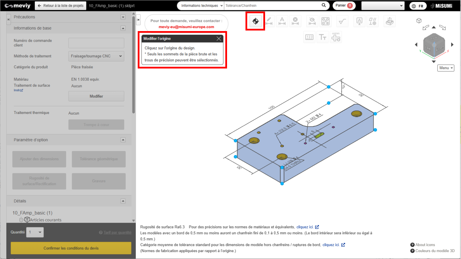 Sur la plateforme meviy, l’origine par défaut correspond au point d’intersection entre les plans dessus, avant et gauche. Il est toutefois possible de modifier cette origine, par exemple en la plaçant au sommet des dimensions extérieures ou au centre d’un trou de précision.