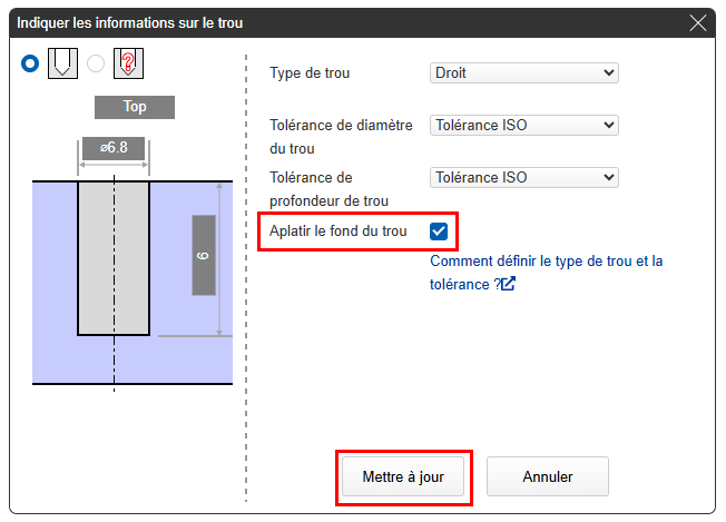 Dans la boîte de dialogue [Instructions d’information sur le trou], sélectionnez « Fond de trou plat » puis cliquez sur [Mettre à jour].