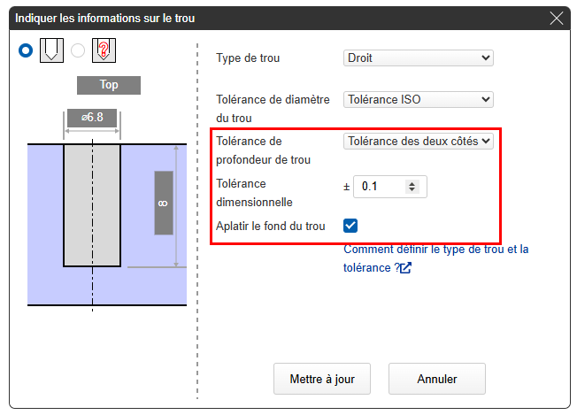 Dans la boîte de dialogue Informations sur le trou, sélectionnez une tolérance de profondeur de trou ou une tolérance de profondeur effective, puis cliquez sur Mettre à jour.