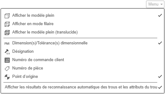 En passant la souris sur le bouton « Menu », vous affichez un menu qui vous permet d’activer ou de désactiver l’affichage du modèle 3D et d’afficher ou de masquer les informations textuelles dans la visionneuse 3D.