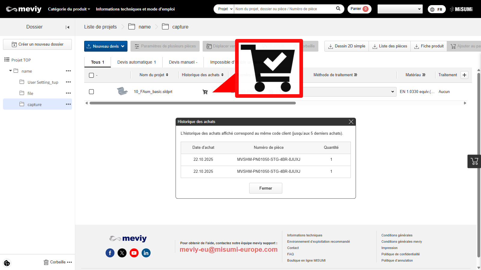 Même s’il s’agit d’un achat portant le même numéro de pièce, l’historique des achats provenant d’un compte MISUMI avec un Code client différent ne sera pas affiché.