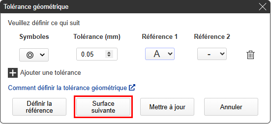 - Si vous appuyez sur le bouton « Sélectionner la surface suivante » sans appuyer sur « Mettre à jour », vous pouvez définir une nouvelle tolérance géométrique sur une autre surface.