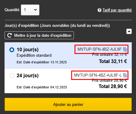 Les numéros de pièce pour les pièces de tournage commencent par “MVTUP”.