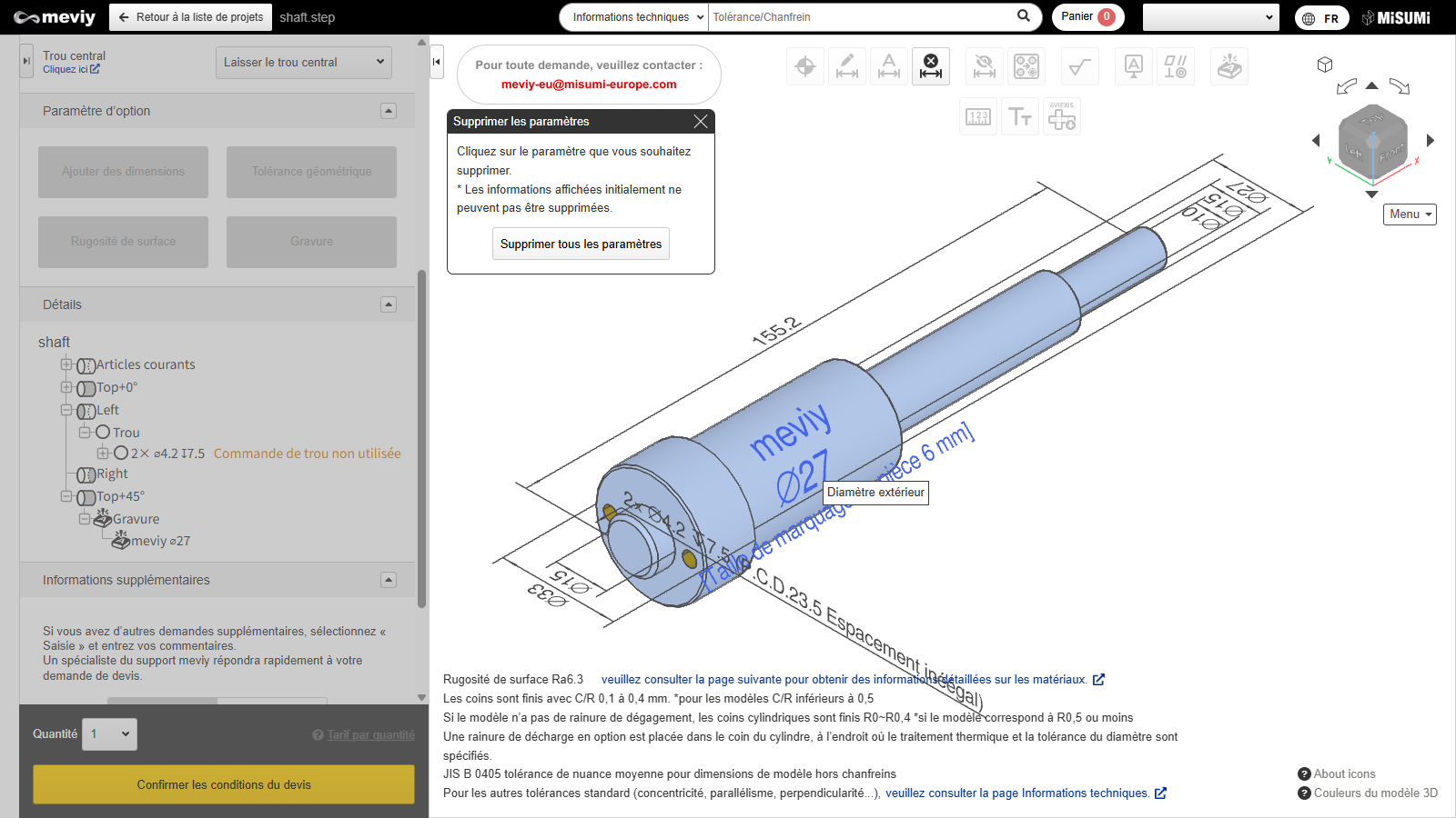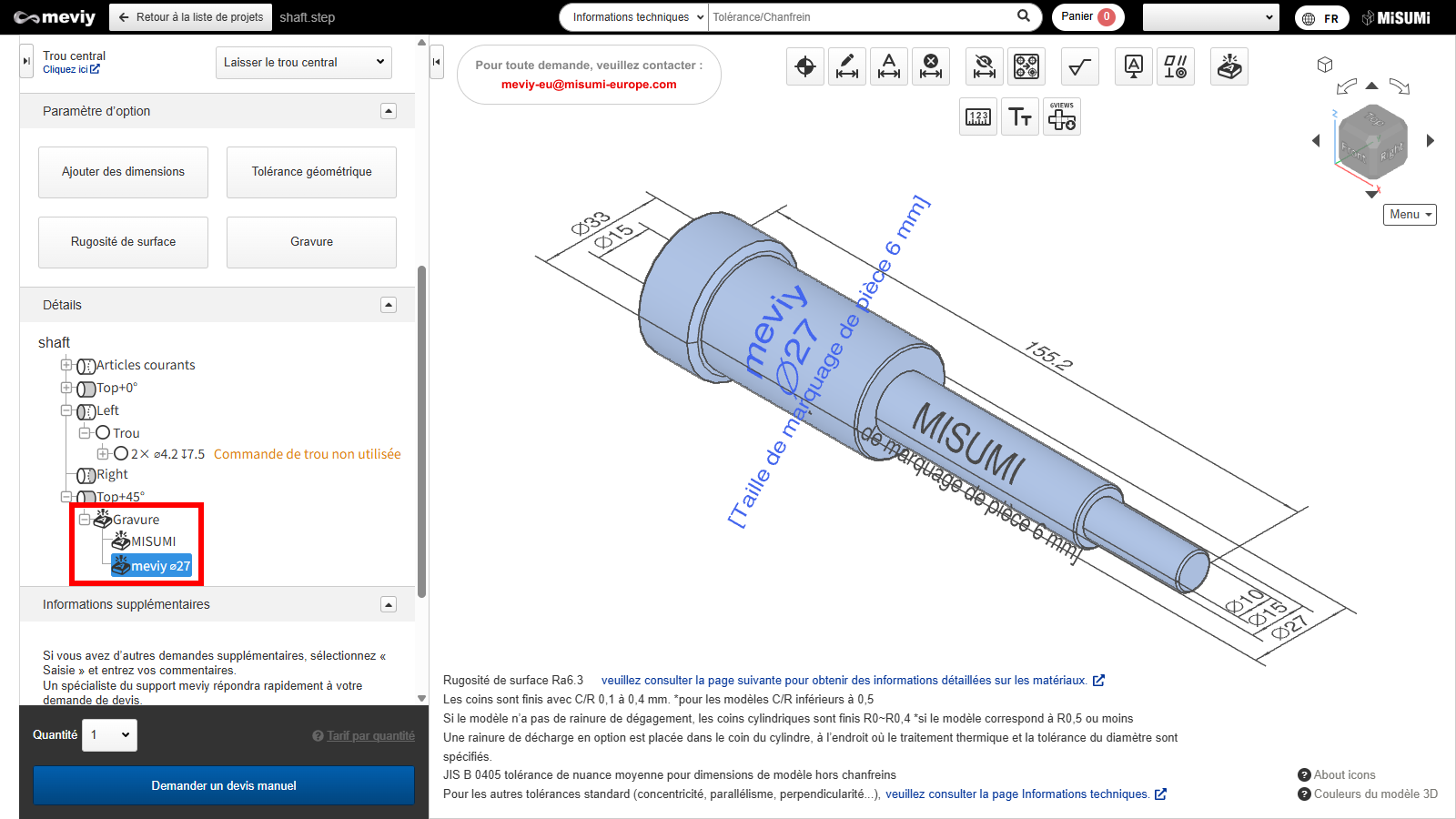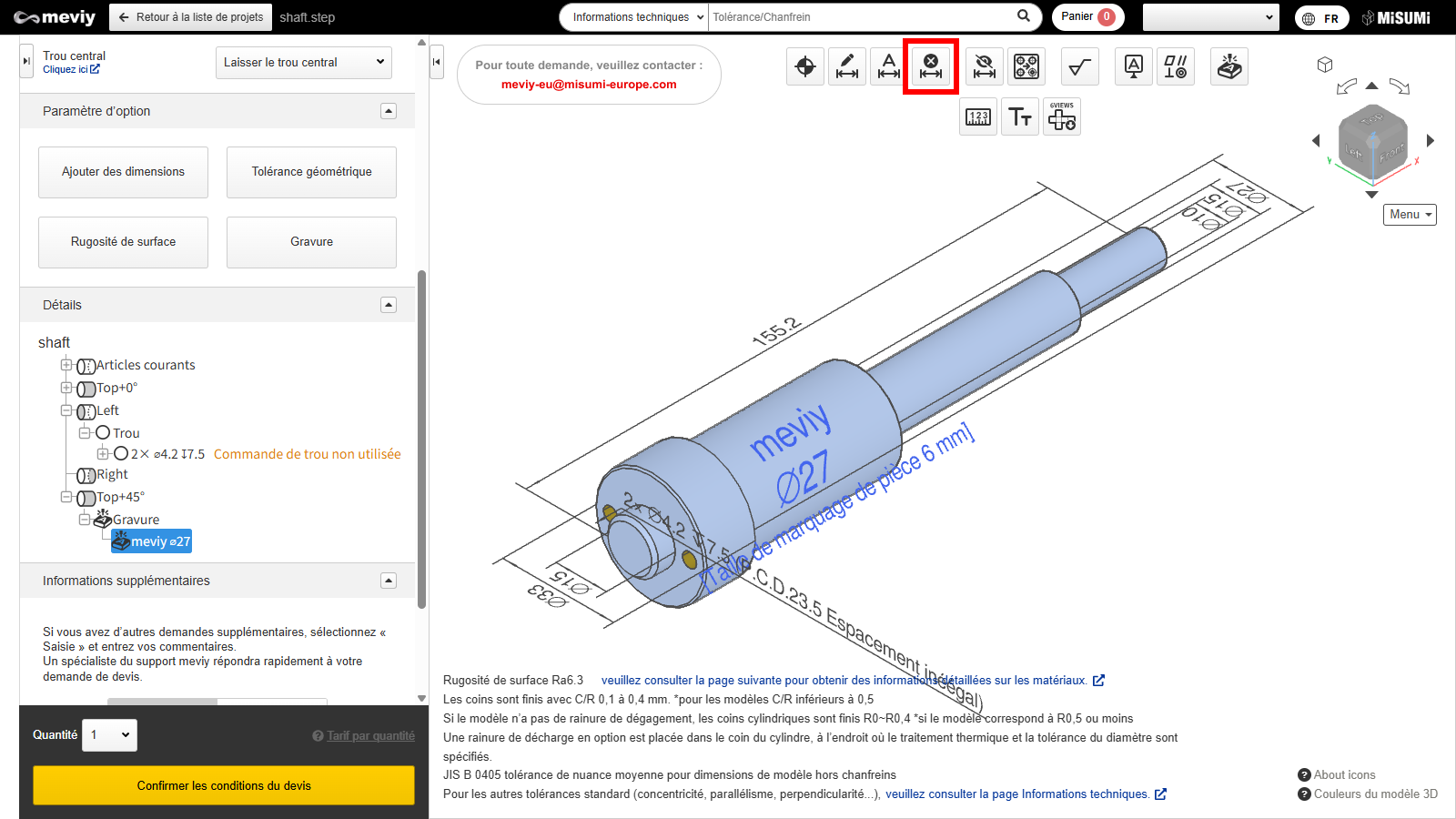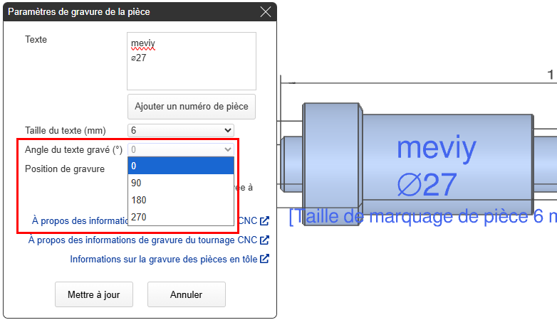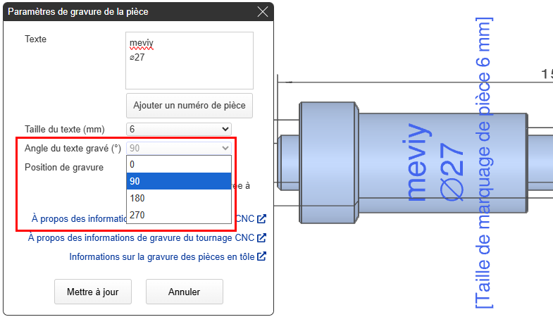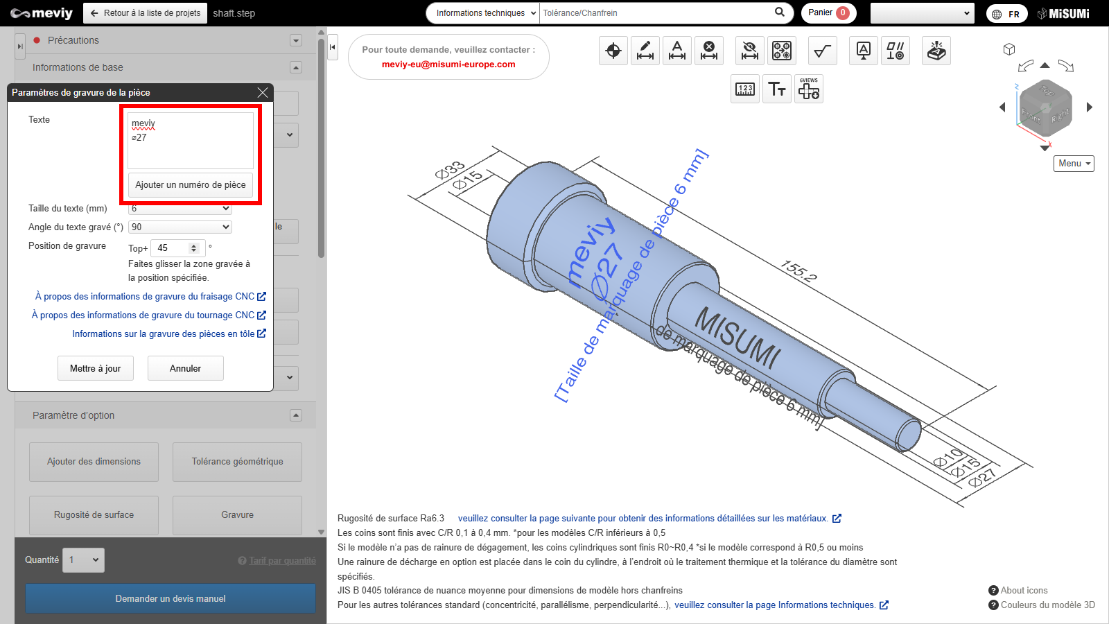 Pour spécifier la gravure du numéro de pièce, cliquez sur « Ajouter un numéro de pièce ». - Un numéro de pièce temporaire (MVTUP-XXX-XXX-XXX-XXX) sera attribué et affiché dans la Visionneuse 3D.