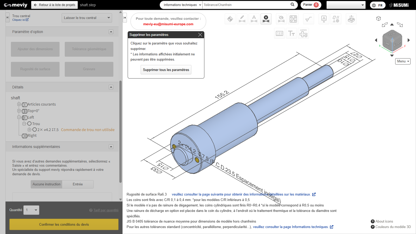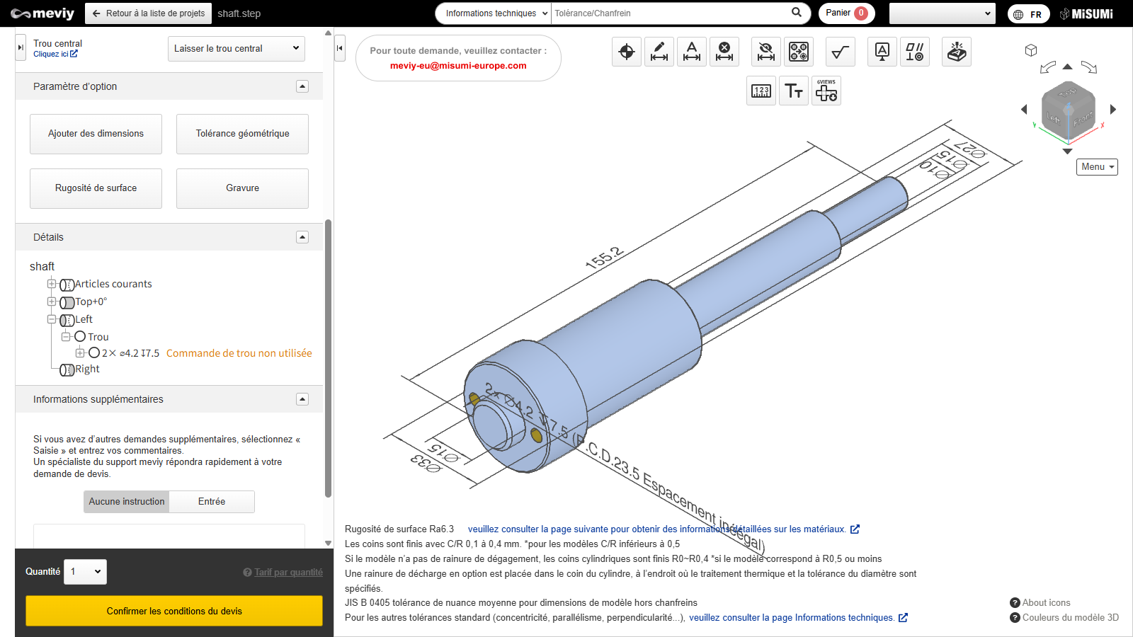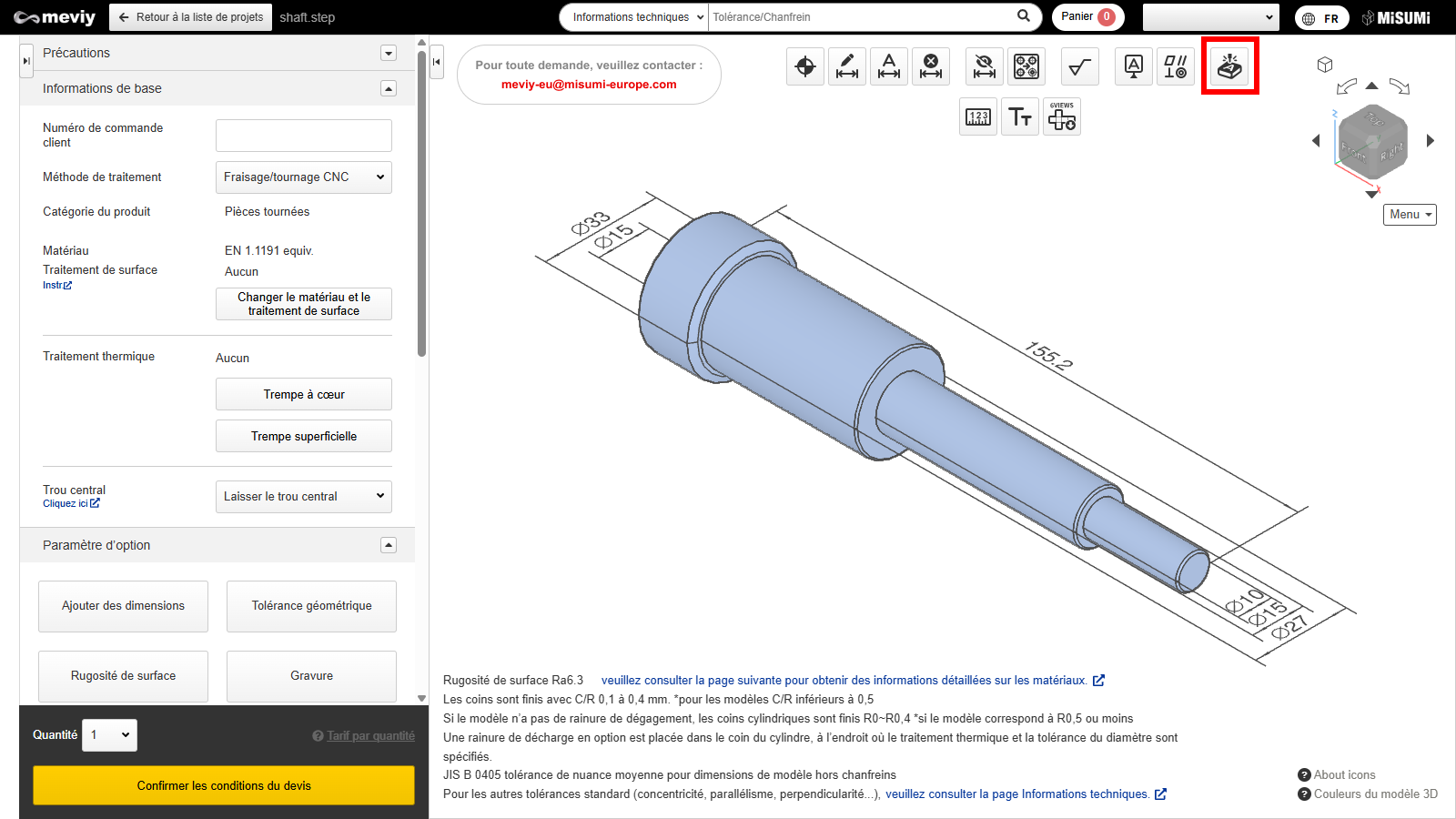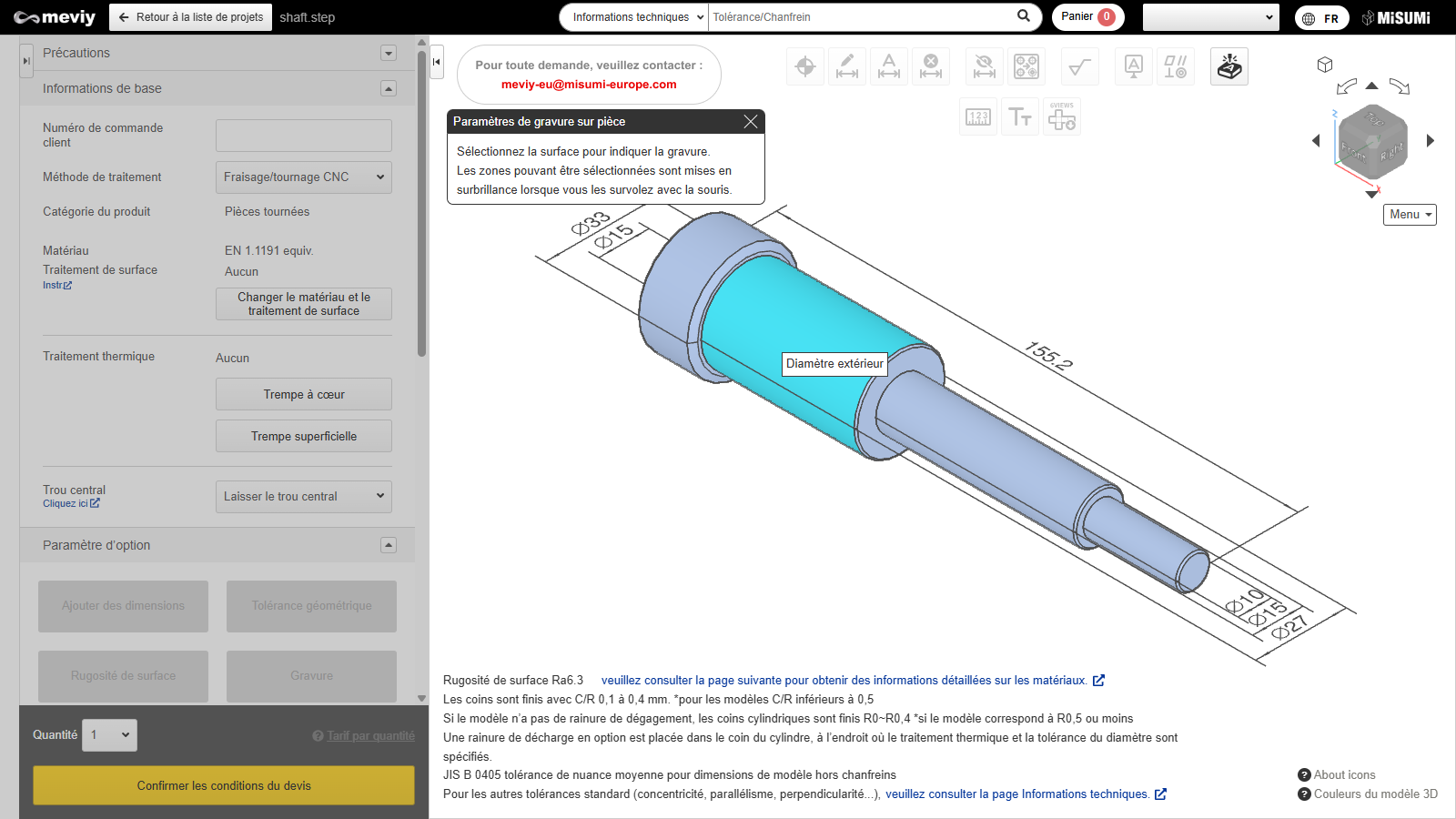 Pour spécifier la gravure du numéro de pièce, cliquez sur « Ajouter un numéro de pièce ». - Un numéro de pièce temporaire (MVTUP-XXX-XXX-XXX-XXX) sera attribué et affiché dans la Visionneuse 3D.
