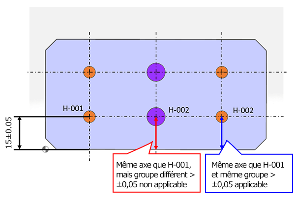 Lorsque des tolérances dimensionnelles sont spécifiées pour « H-001 », elles s’appliquent également à « H-002 » lorsqu’ils sont situés sur le même axe et appartiennent au même groupe.