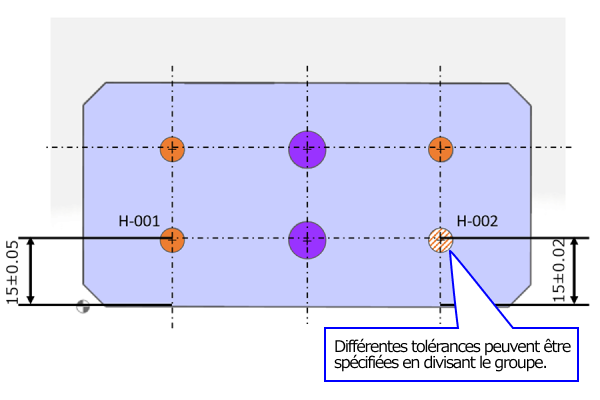 Si vous souhaitez spécifier des tolérances de dimensions différentes pour H-001 et H-002, vous devez d’abord diviser le groupe.