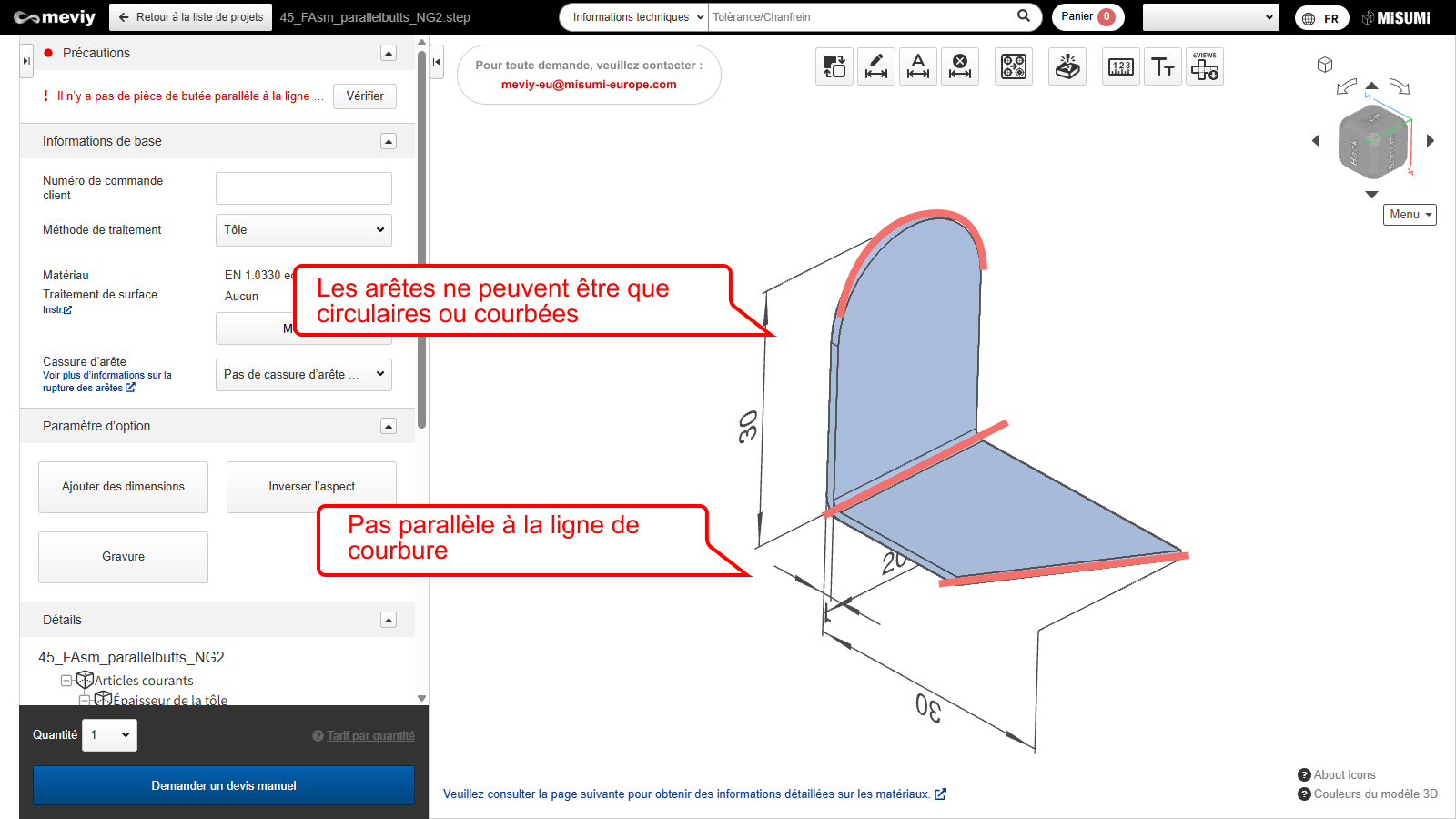 - Pour les pièces en tôle, la plateforme meviy effectue une analyse d’interférence pour le processus de pliage.