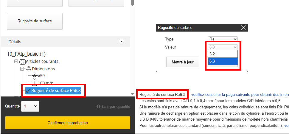 - Vous pouvez sélectionner √Ra6,3/3,2 pour la rugosité de surface dans Paramètres utilisateur > Paramètres de devis initial.