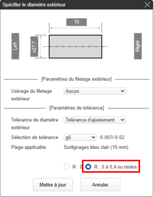 ②Si vous spécifiez « Coin R0 à R0,4 ou moins » dans la boîte de dialogue