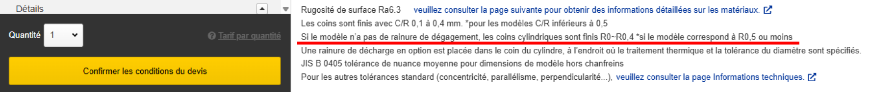 - Lorsque vous souhaitez minimiser le rayon d’angle R ou spécifier la rainure de dégagement