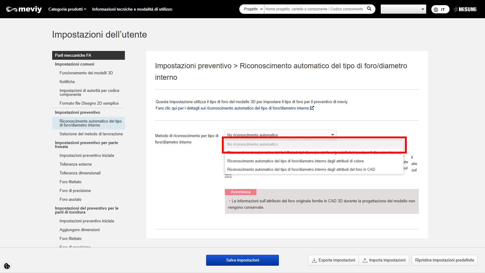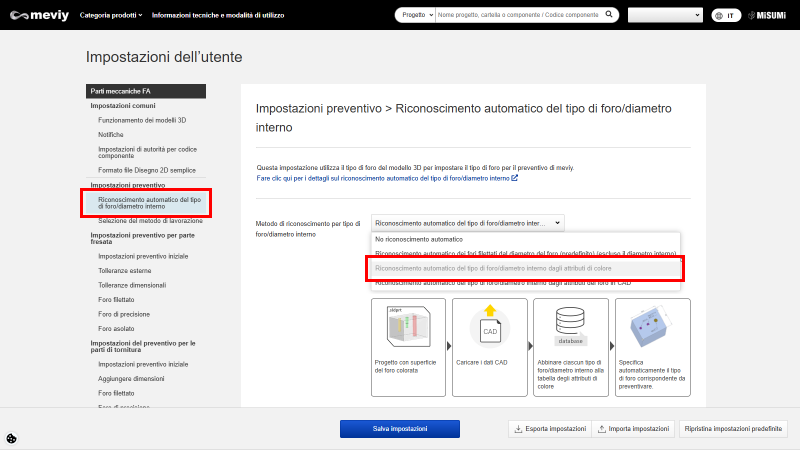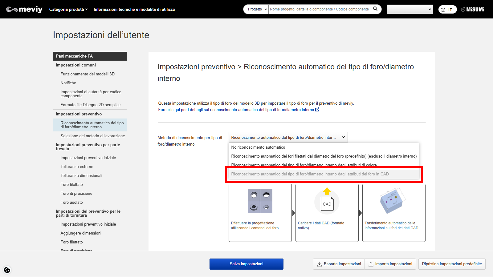 Per i modelli e i formati CAD non supportati da meviy, non è garantito il riconoscimento automatico del tipo di foro.