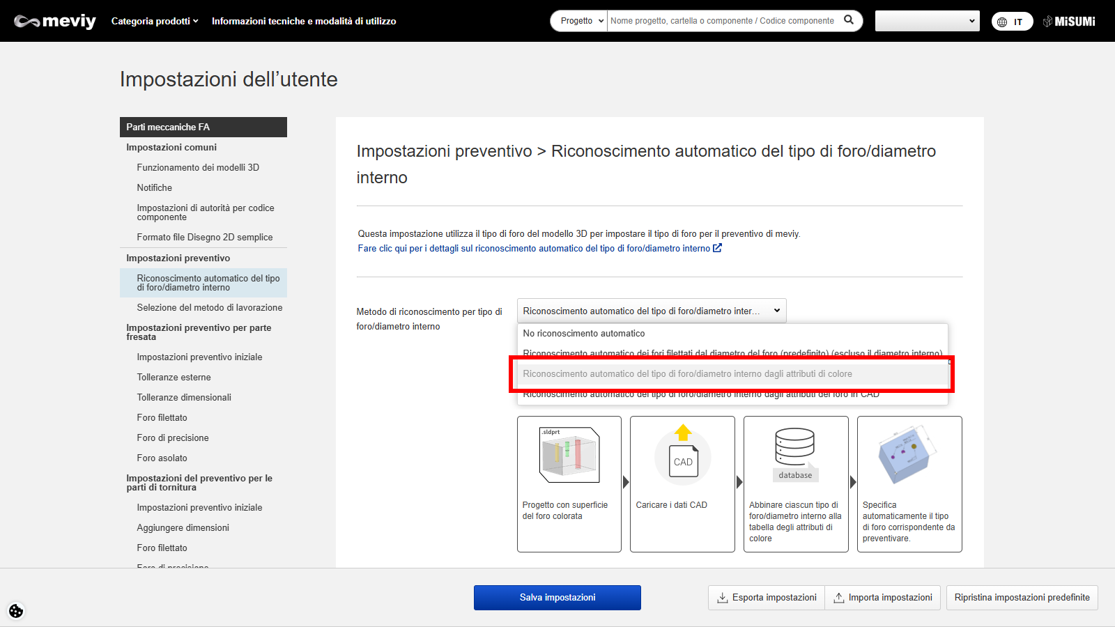 Per i modelli e i formati CAD non supportati da meviy, non è garantito il riconoscimento automatico del tipo di foro.