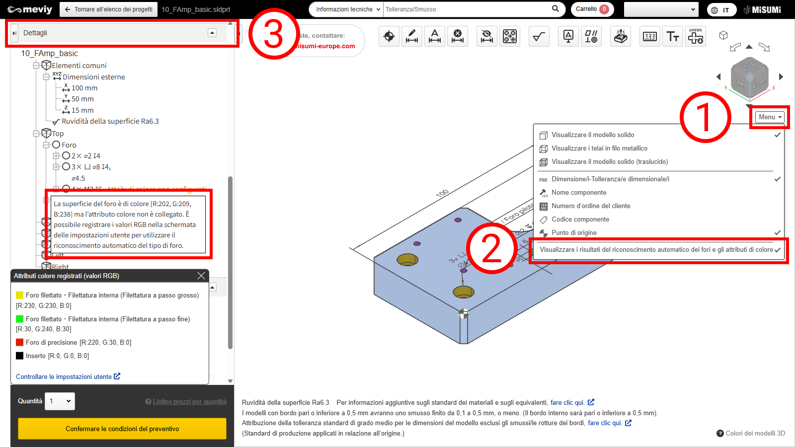 I risultati del riconoscimento automatico dei fori e gli attributi di colore possono essere controllati nella schermata del visualizzatore 3D