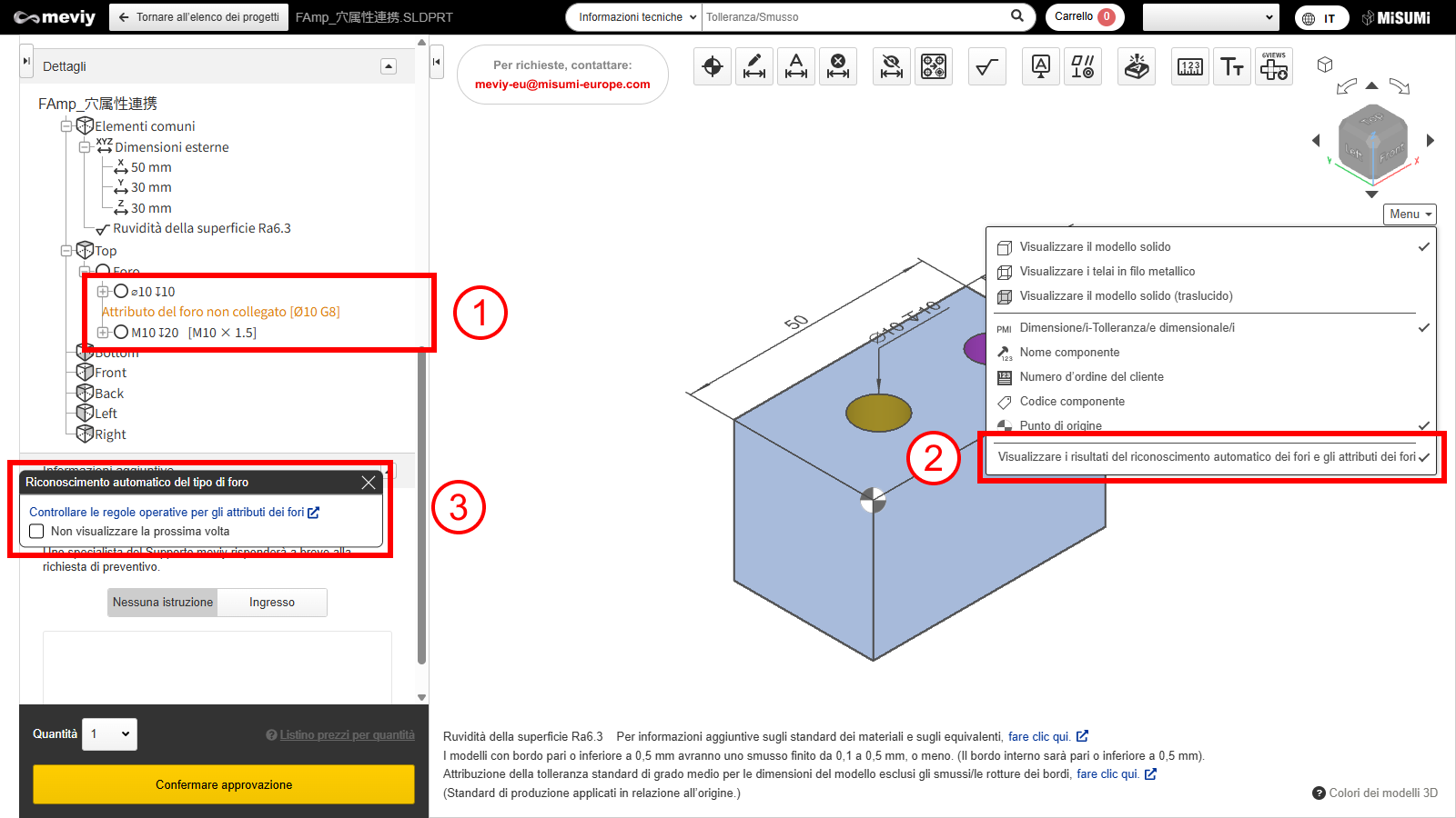 - Modificare il tipo di foro nel visualizzatore 3D di meviy.
