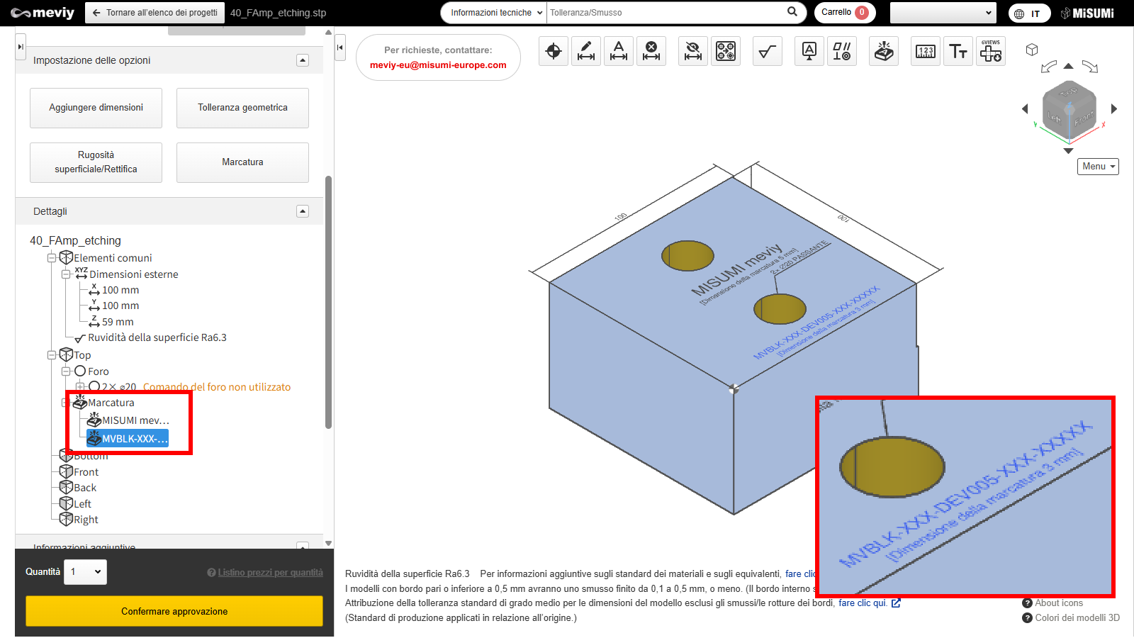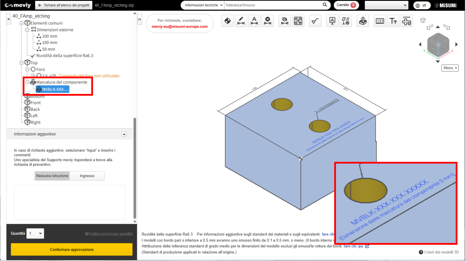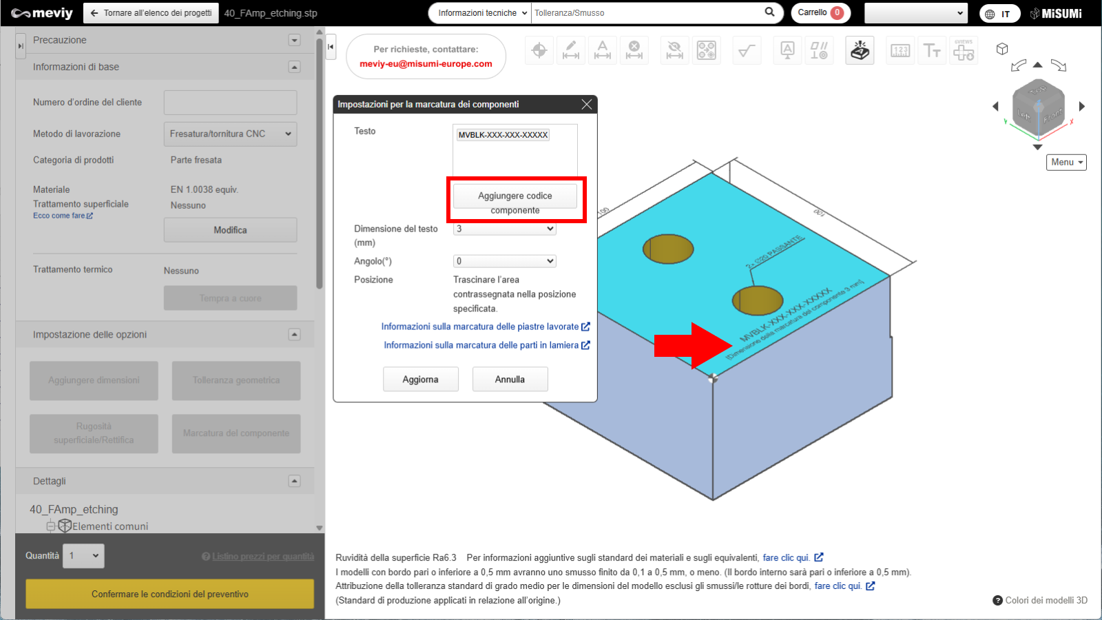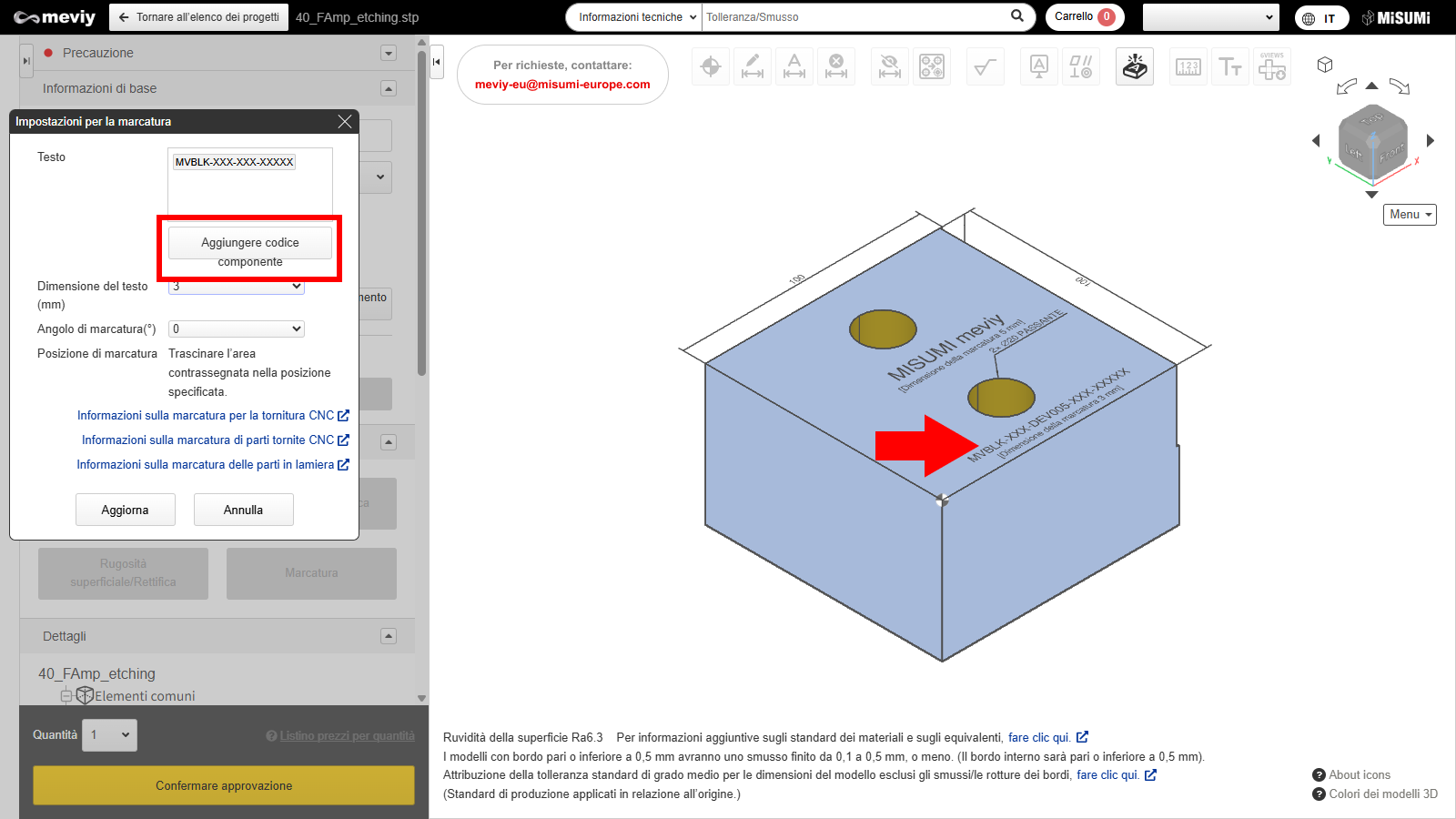 - Per specificare l’incisione del codice componente, fare clic su “Aggiungi codice componente”. Verrà emesso un codice componente temporaneo (MVBLK-XXX-XXX-XXX-XXX) che verrà visualizzato nel Visualizzatore 3D.