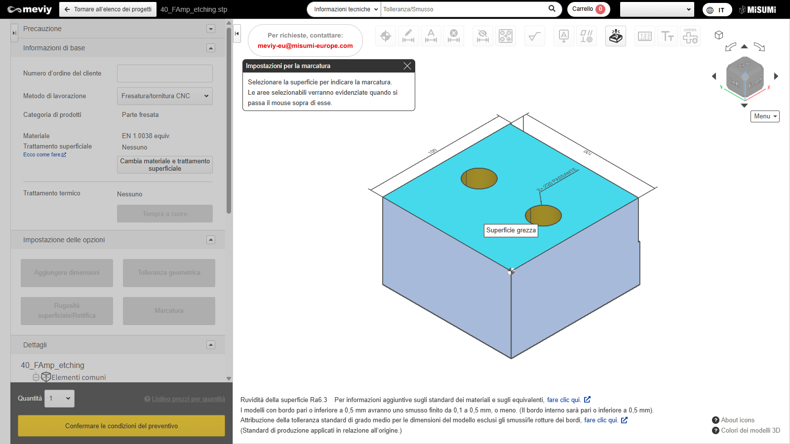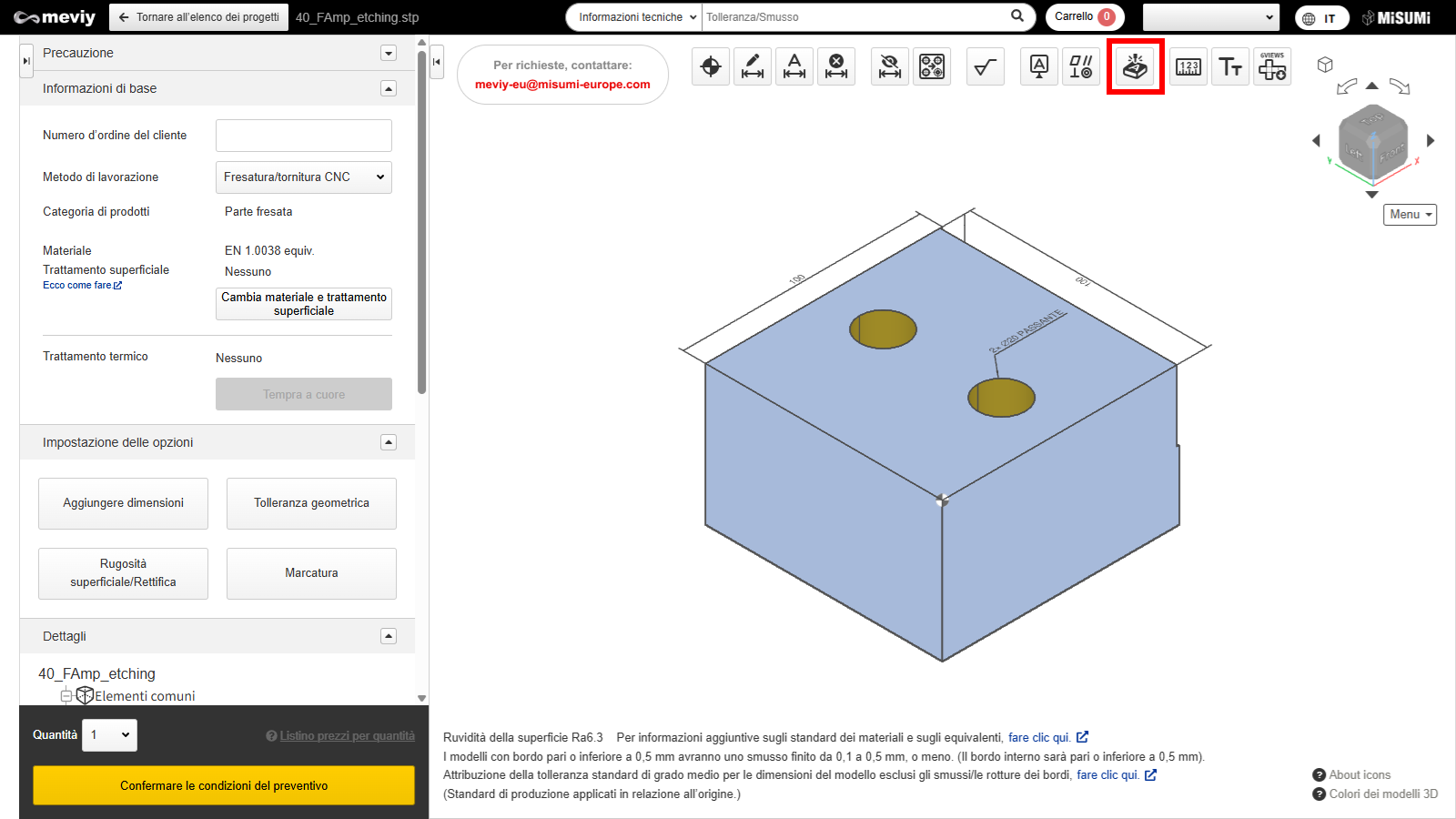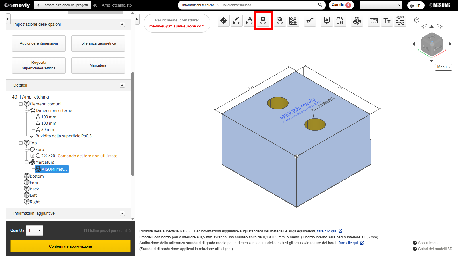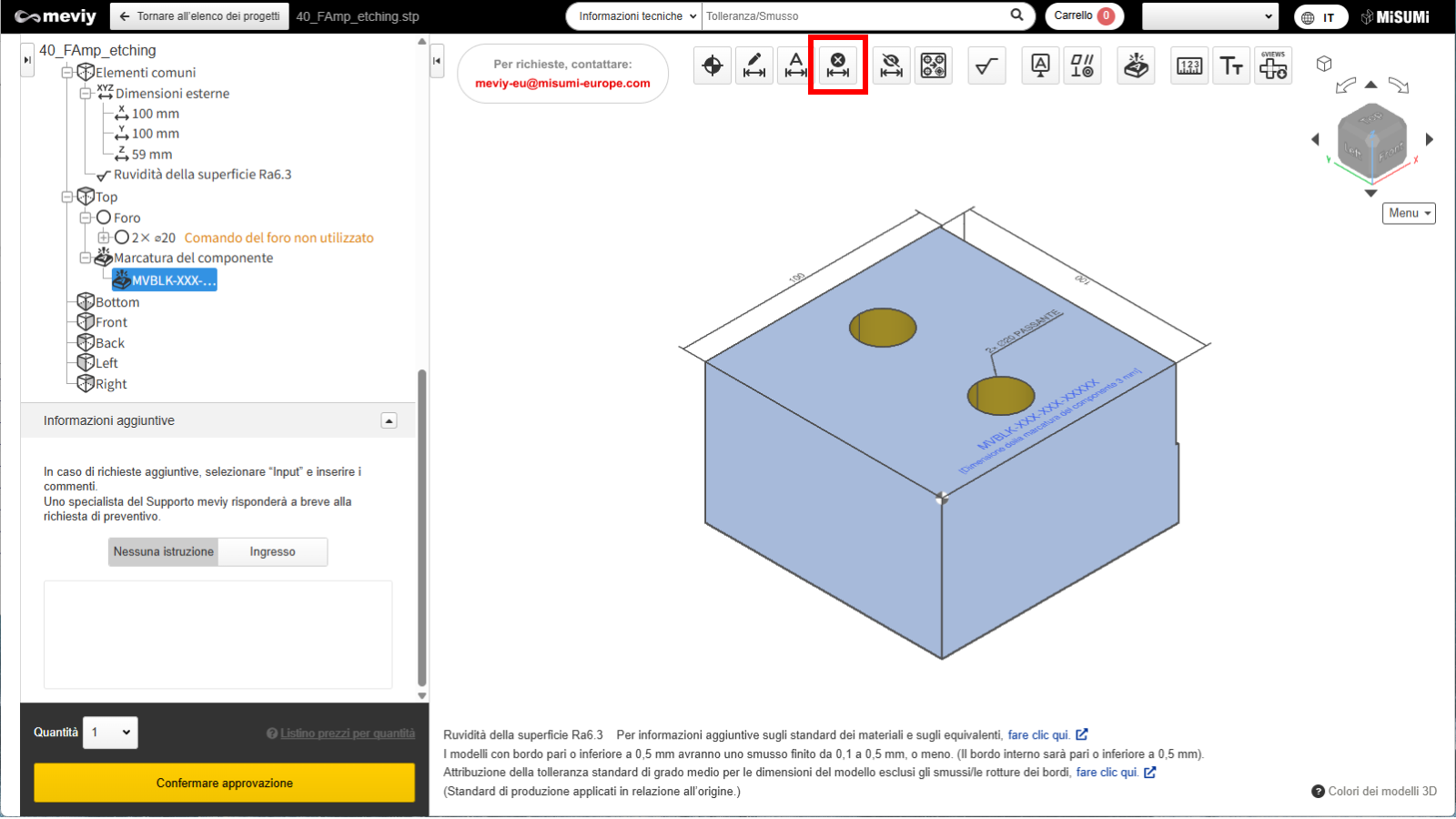 - Per specificare l’incisione del codice componente, fare clic su “Aggiungi codice componente”. Verrà emesso un codice componente temporaneo (MVBLK-XXX-XXX-XXX-XXX) che verrà visualizzato nel Visualizzatore 3D.
