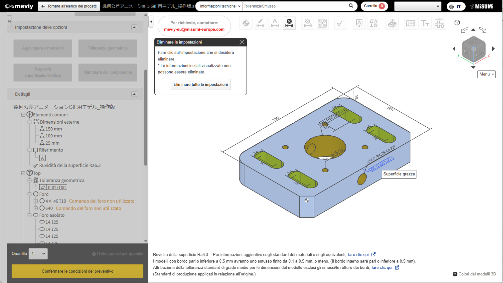 Viene visualizzato il messaggio “Cliccare su Cancella impostazioni”. Selezionare la tolleranza geometrica/il punto di riferimento che si desidera cancellare. La tolleranza geometrica/il punto di riferimento corrispondente si illumina in blu. Verrà cancellato quando si clicca su di esso.