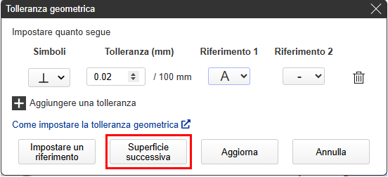 - Cliccando “Seleziona superficie successiva” senza premere Aggiorna, è possibile impostare una nuova tolleranza geometrica su un’altra superficie.