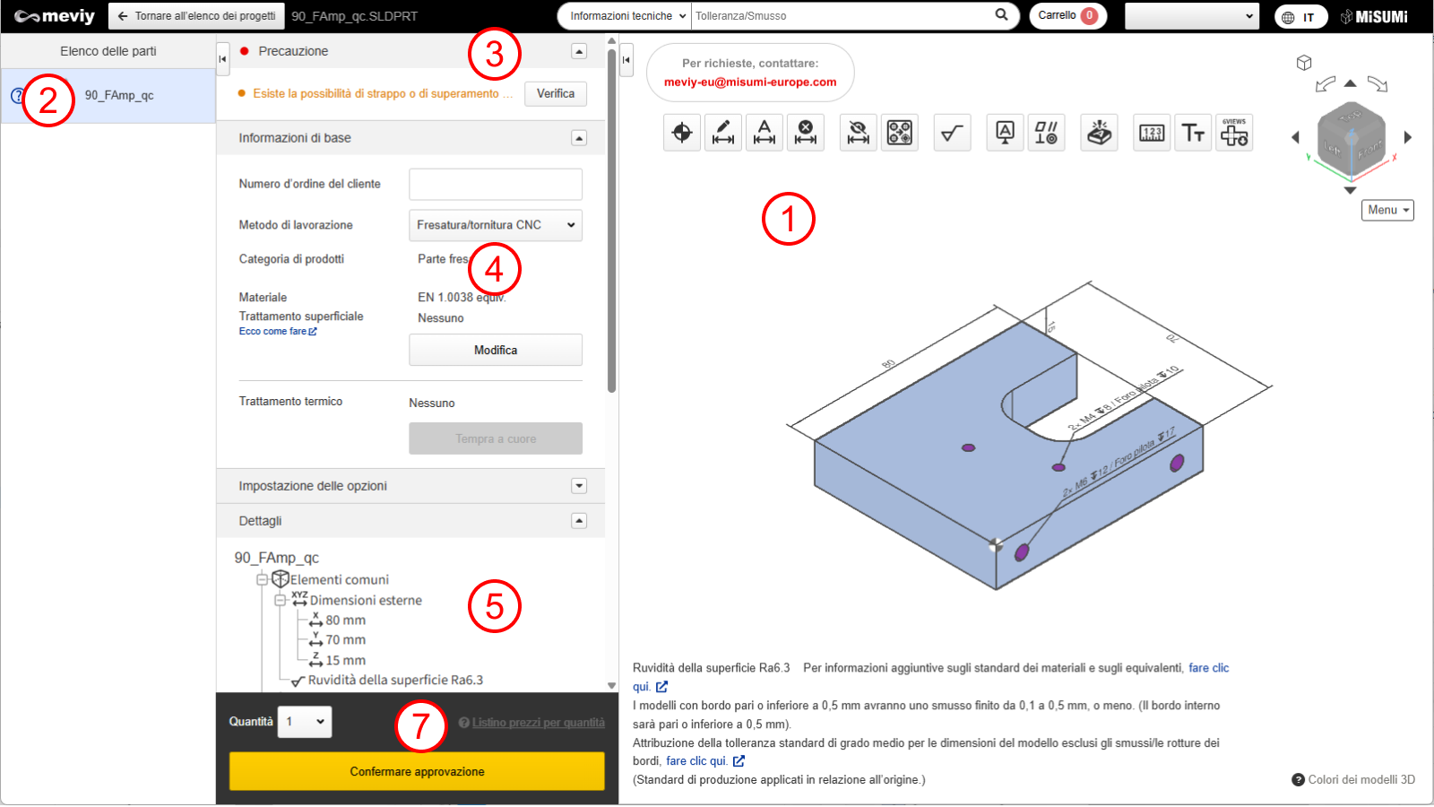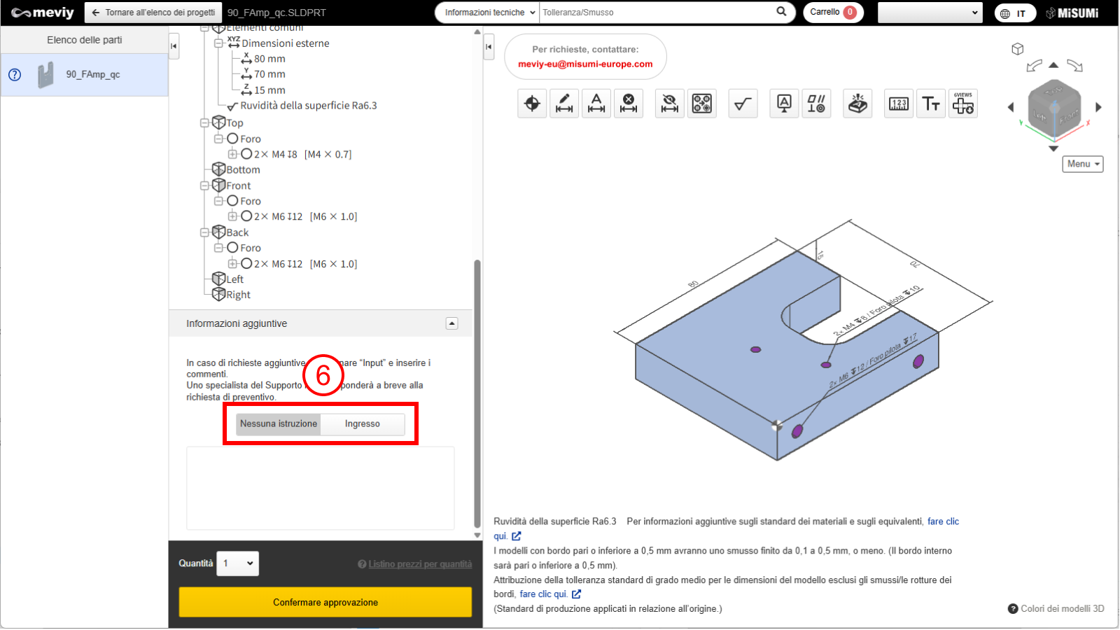 - È possibile specificare richieste o domande aggiuntive, come istruzioni di lavorazione aggiuntive che non possono essere configurate su meviy.