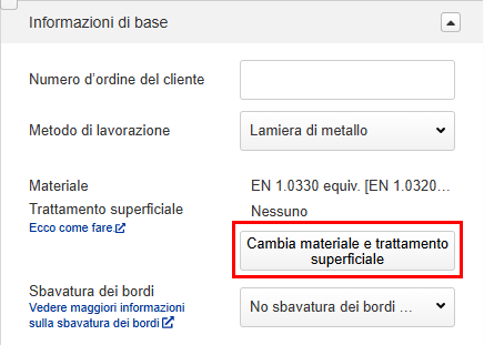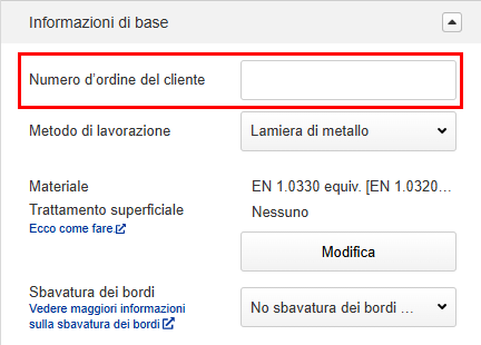 Nella scheda [Informazioni di base] è possibile modificare le quantità dell’offerta, cambiare i materiali o i trattamenti superficiali, impostare numeri d’ordine personalizzati del cliente e inserire ulteriori istruzioni di lavorazione. I prezzi e i tempi di consegna saranno ricalcolati in base alle specifiche modificate.