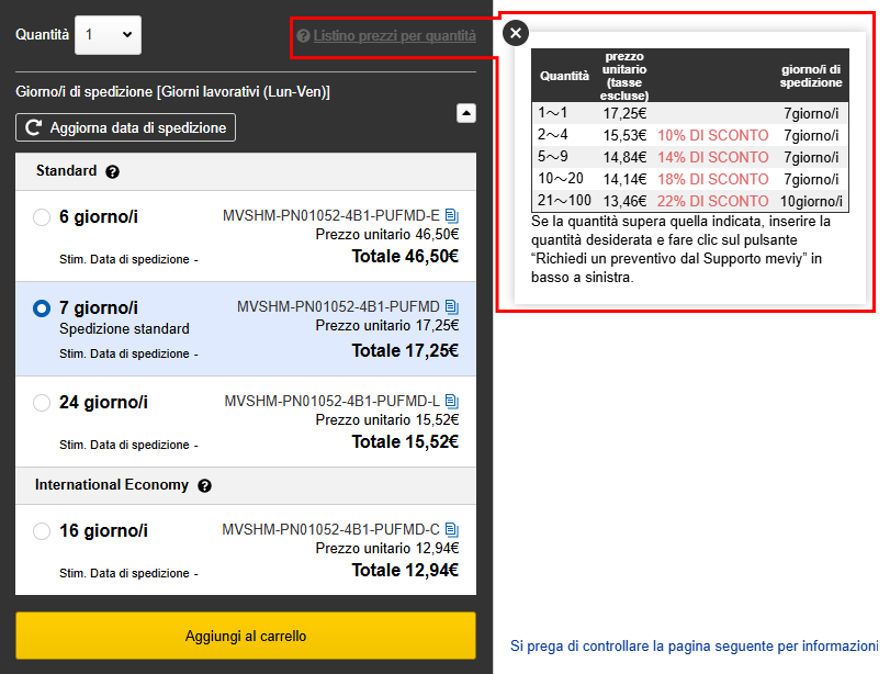 È possibile controllare il prezzo e la data di consegna per ciascuna quantità nel “Listino prezzi in base alla quantità”.