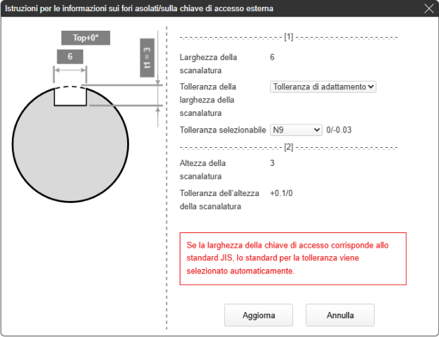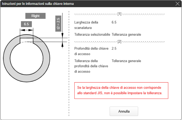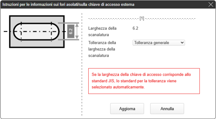 - Per le cave che rispettano lo standard JIS (B 1301:1996), le tolleranze vengono impostate automaticamente e possono essere modificate nella finestra di dialogo.