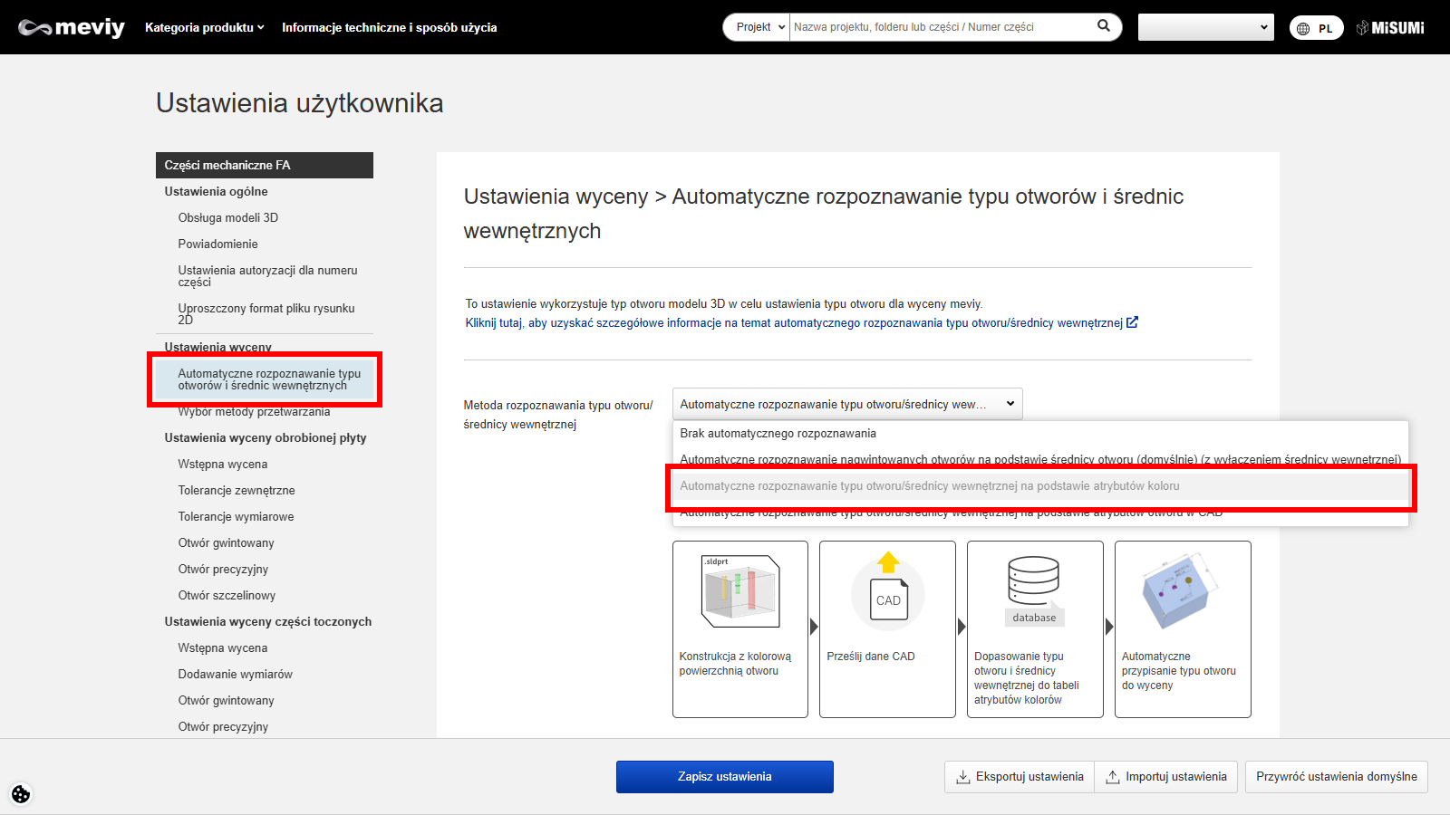 Jeżeli wybrano opcję [Automatyczne rozpoznawanie typu otworu na podstawie atrybutów kolorów], można wykorzystać ustawienia RGB do przeniesienia atrybutu koloru z danych CAD do systemu meviy.
