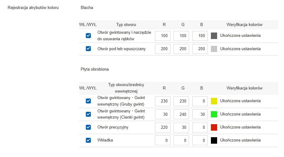 - * Formularz rejestracji atrybutów koloru jest dostępny tylko przy wybraniu metody „Automatyczne rozpoznawanie typu otworu na podstawie atrybutów koloru”.