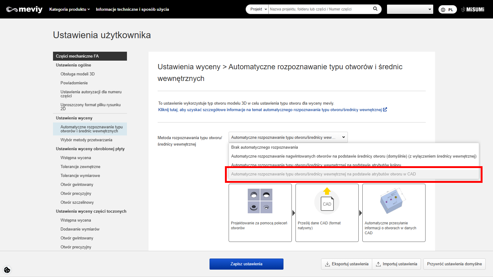 W menu ustawień użytkownika wybierz „Ustawienia automatycznego rozpoznawania typów otworów”.