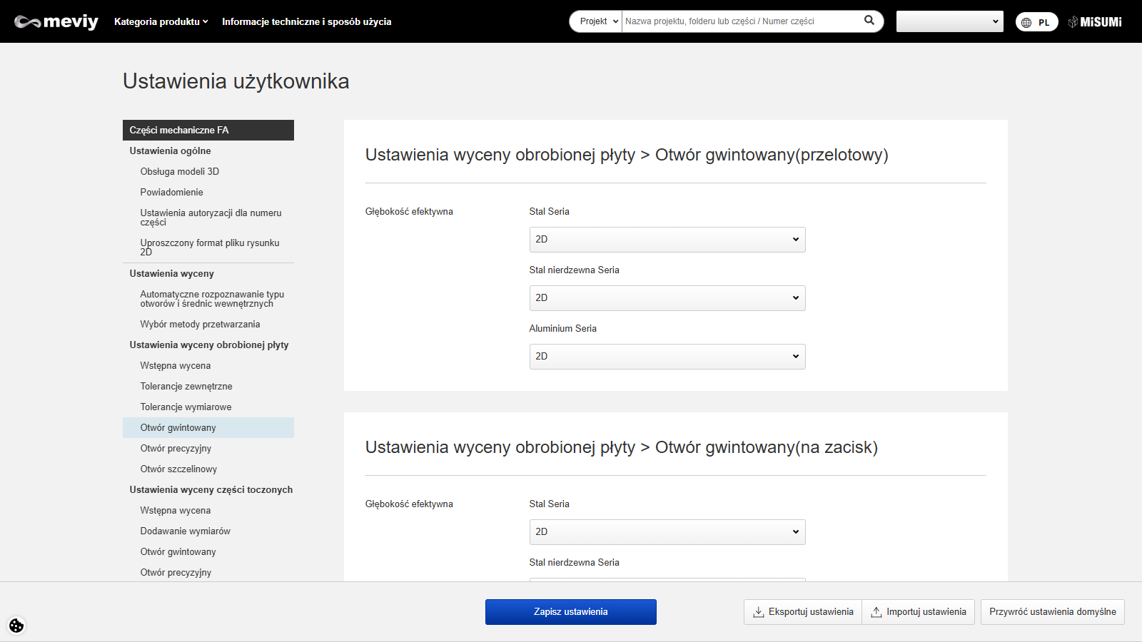 (5) Głębokość użytkowa otworów gwintowanych i precyzyjnych nie będzie powiązana — zostaną użyte dane z ustawień użytkownika.