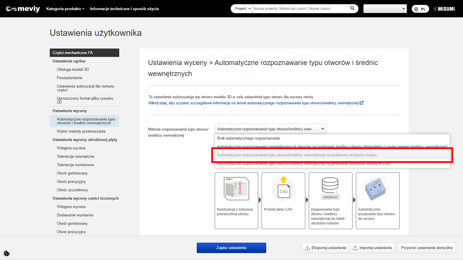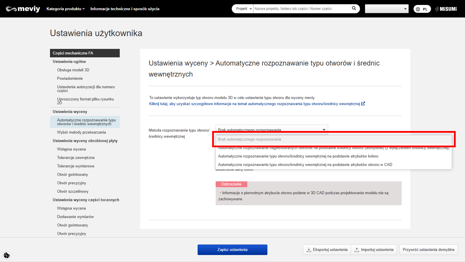 W przypadku modeli lub formatów CAD nieobsługiwanych przez meviy rozpoznawanie typów otworów nie jest gwarantowane.