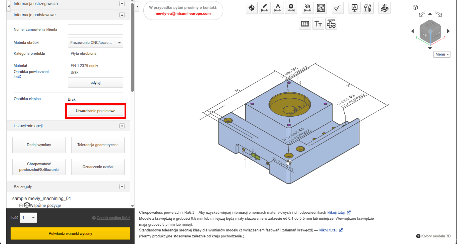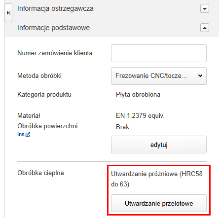 Zmianę wyboru utwardzania można potwierdzić w sekcji „Podstawowe informacje” obok „Obróbka cieplna”.