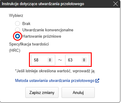 Jeśli po wybraniu opcji Poprzez utwardzanie materiał zostanie zmieniony, twardość automatycznie ulegnie zmianie na standardową twardość materiału po zmianie.