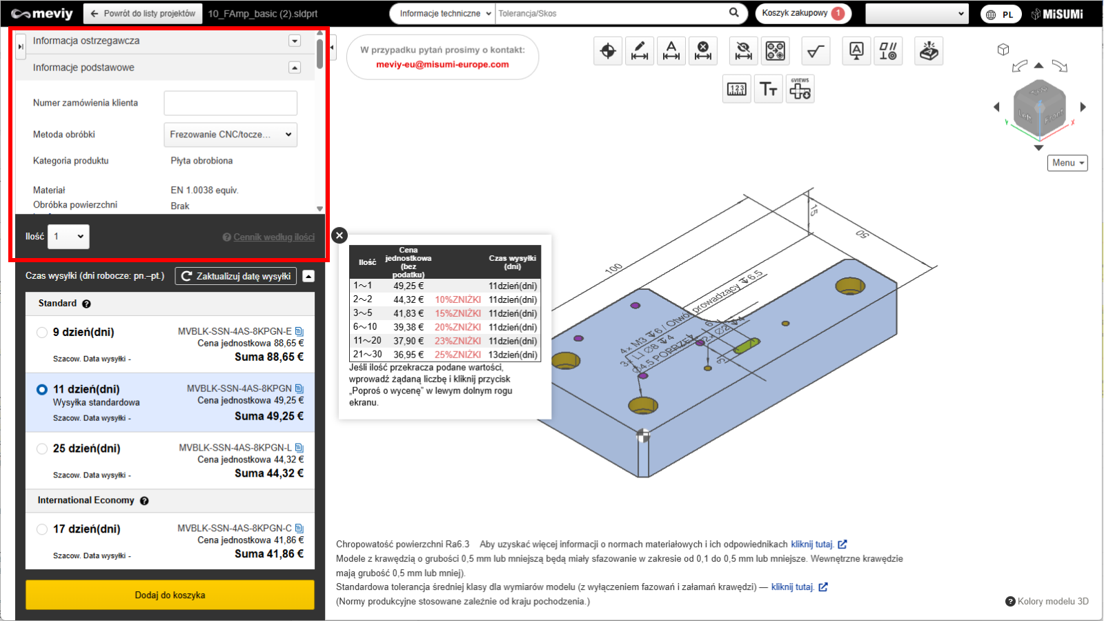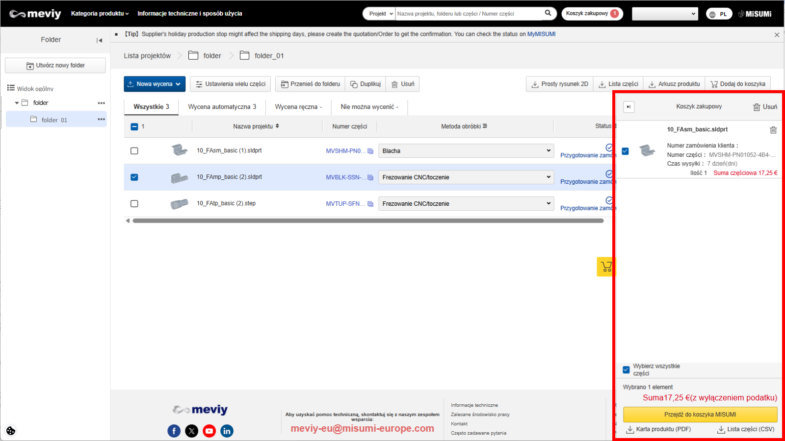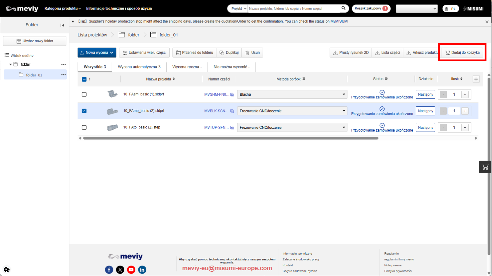 1. Wróć do listy projektów i dodaj wybrane części do listy produktów, aby sprawdzić wyniki wyceny.