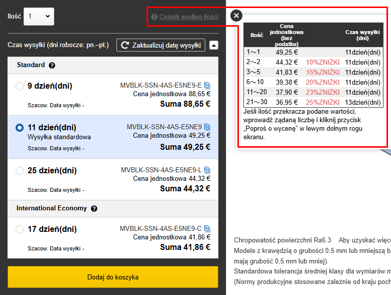 Cenę i termin dostawy dla każdej liczby sztuk można sprawdzić w sekcji „Cennik według ilości”.