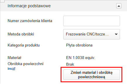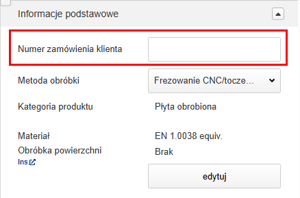 W zakładce [Podstawowe informacje] możesz zmienić ilości w ofercie, materiały lub obróbkę powierzchni, ustawić niestandardowe numery zamówień klienta oraz wprowadzić dodatkowe instrukcje obróbki. Ceny i terminy dostaw zostaną przeliczone zgodnie z nową specyfikacją.