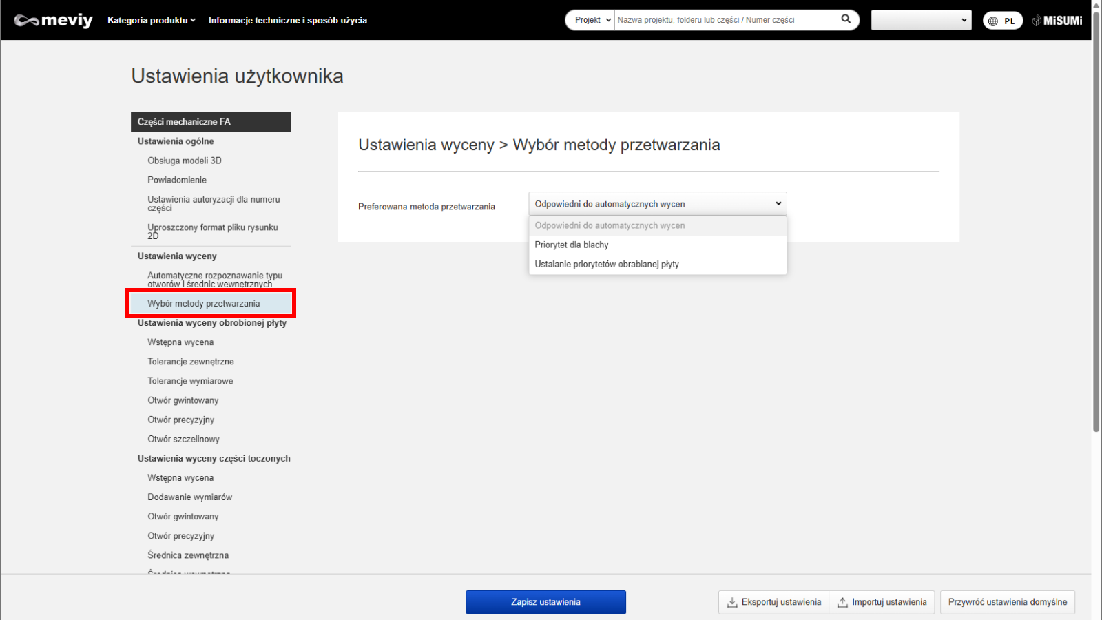 - Otwórz ustawienia użytkownika i kliknij „Ustawienia wyboru metody obróbki”.