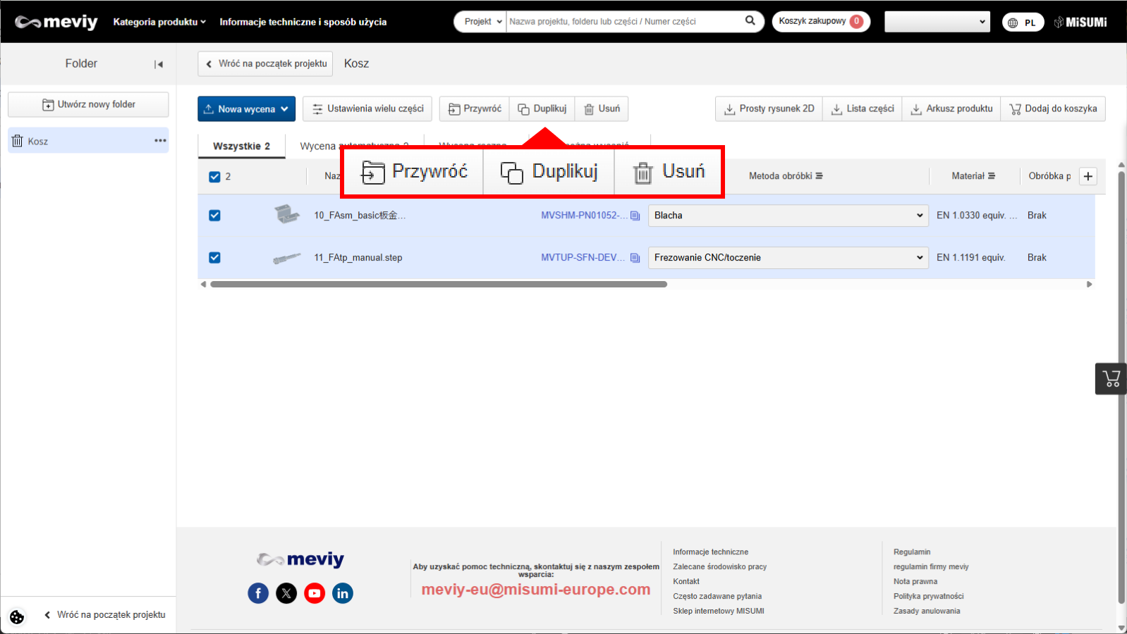 Usuwanie lub przywracanie projektu w folderze Kosz