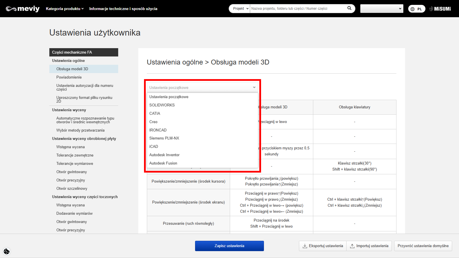 Sposoby obsługi odpowiednie dla poszczególnych typów CAD można zmienić w ustawieniach użytkownika.