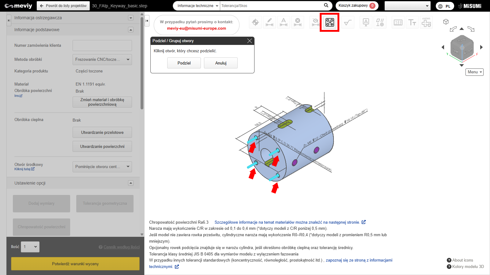 • Po rozdzieleniu można indywidualnie ustawić typy otworów i tolerancje średnicy.