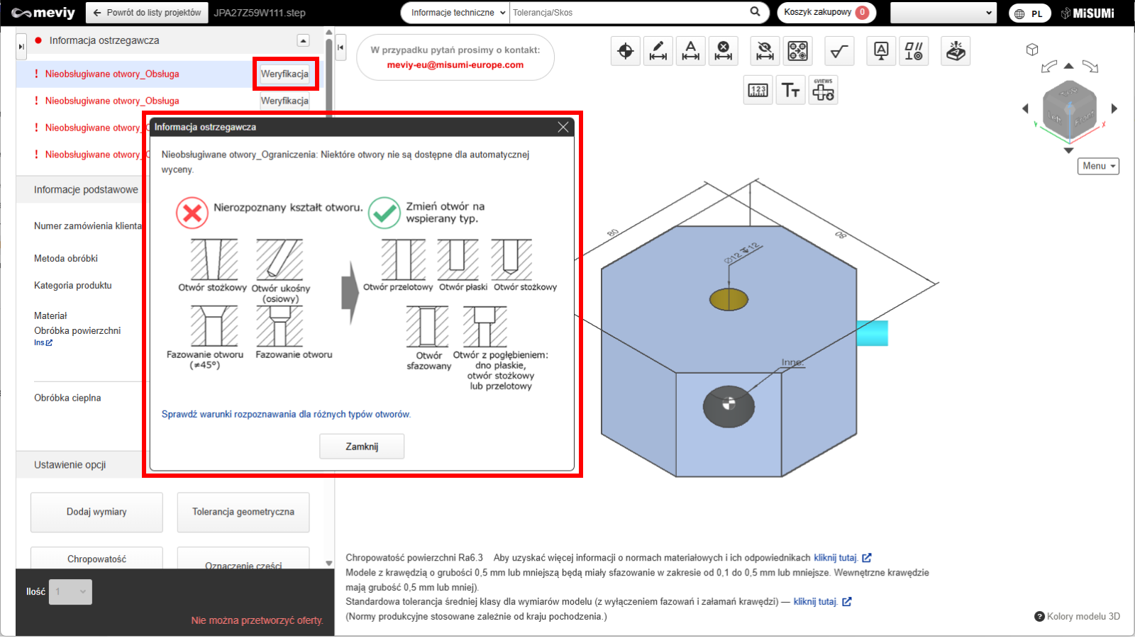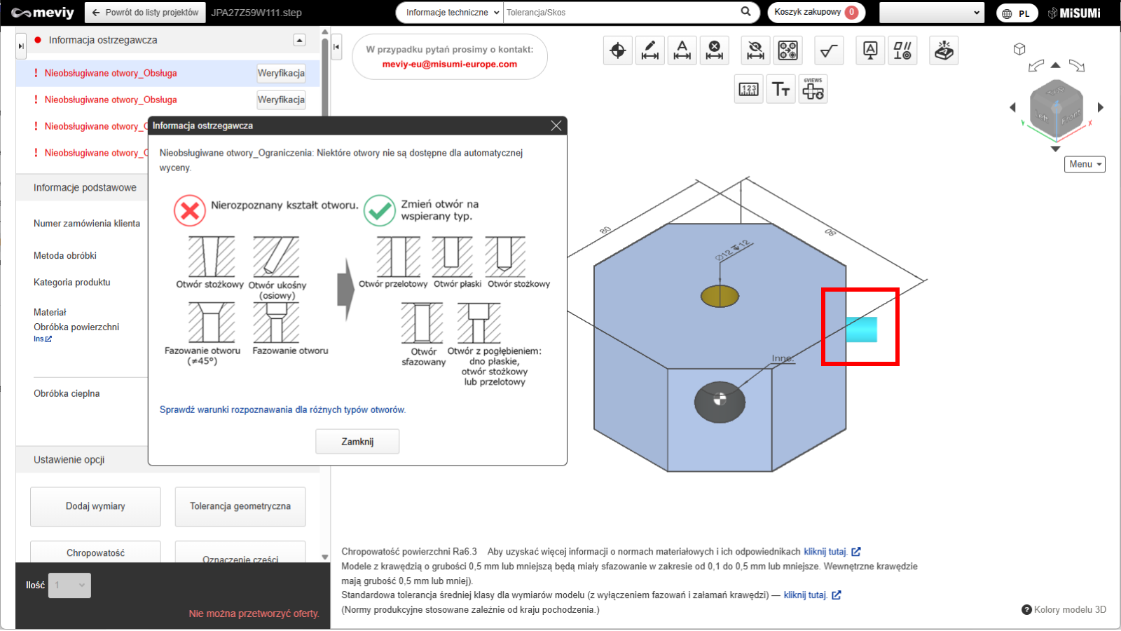 Podczas przesyłania modelu do platformy meviy może wystąpić błąd uniemożliwiający automatyczną wycenę modelu.