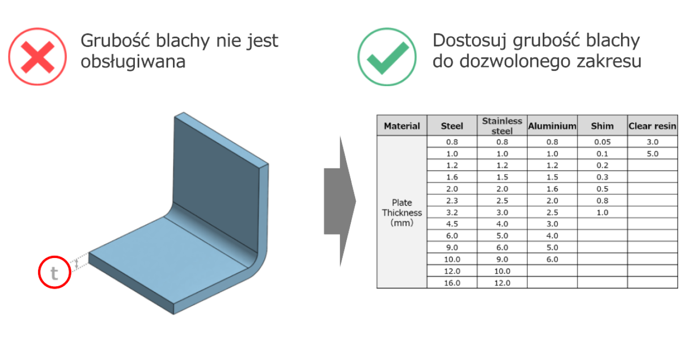 - Aby rozwiązać ten problem, zmodyfikuj model tak, aby odpowiadał odpowiednim grubościom blachy.