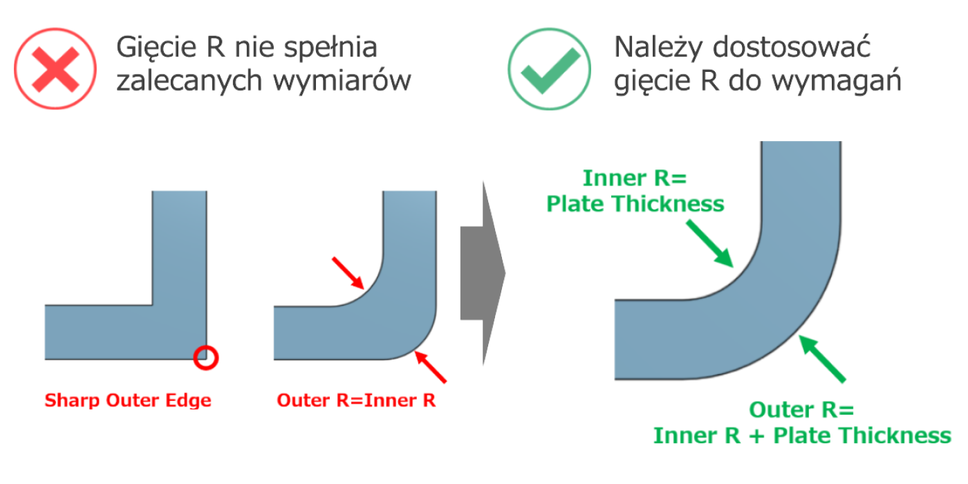 - Ten błąd występuje, gdy grubość blachy nie jest stała podczas modelowania lub gdy ustawienie długości R nie mieści się w prawidłowym zakresie.