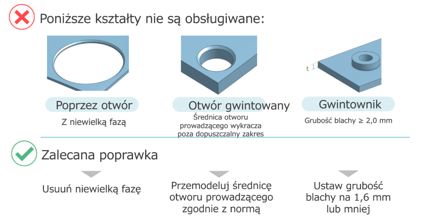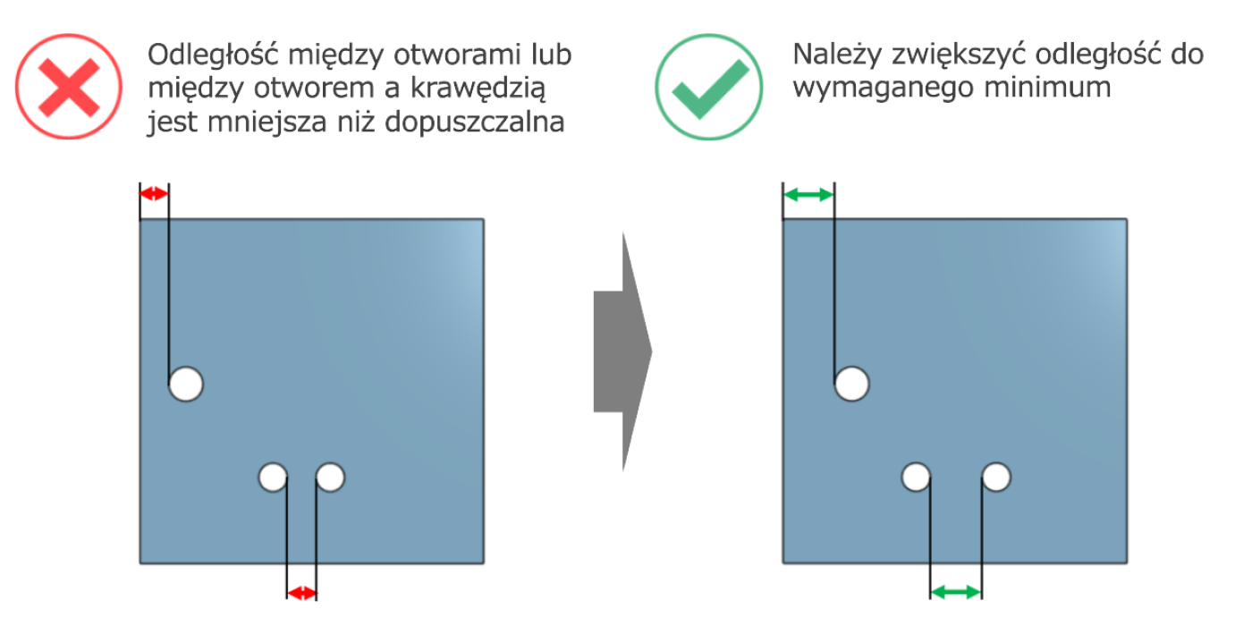 - Aby rozwiązać ten problem, należy zwiększyć odległość między otworem a powierzchnią czołową/otworem.