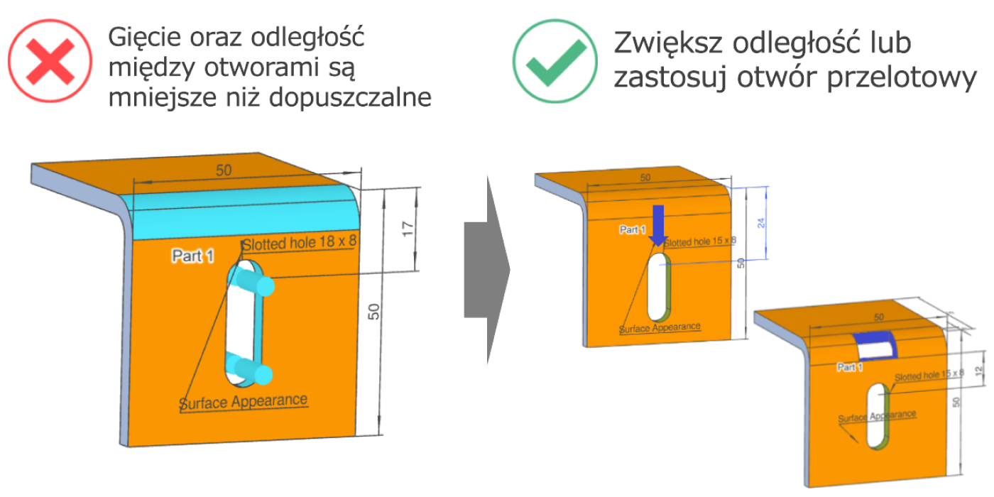 - Aby rozwiązać ten problem, należy zwiększyć odległość między zagięciem a otworem lub utworzyć otwór na linii zagięcia (otwór przelotowy).