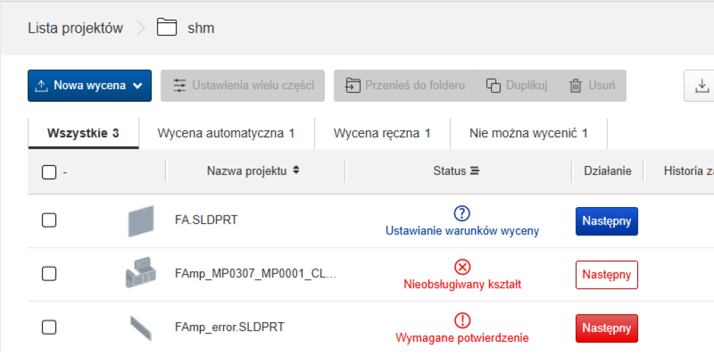 Błąd wyceny oznacza sytuację, w której system meviy nie może automatycznie wygenerować wyceny na podstawie przesłanego modelu 3D.