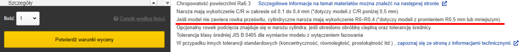 "*Wykończenie promieniem (R) w zakresie od 0,1 do 0,5 mm."