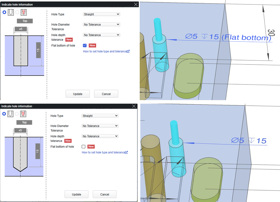 A1: Engineers can now select a flat bottom for compatible blind holes. This ensures the manufactured part matches CAD intent, providing a stable seating surface for pins, valves, or sensors.